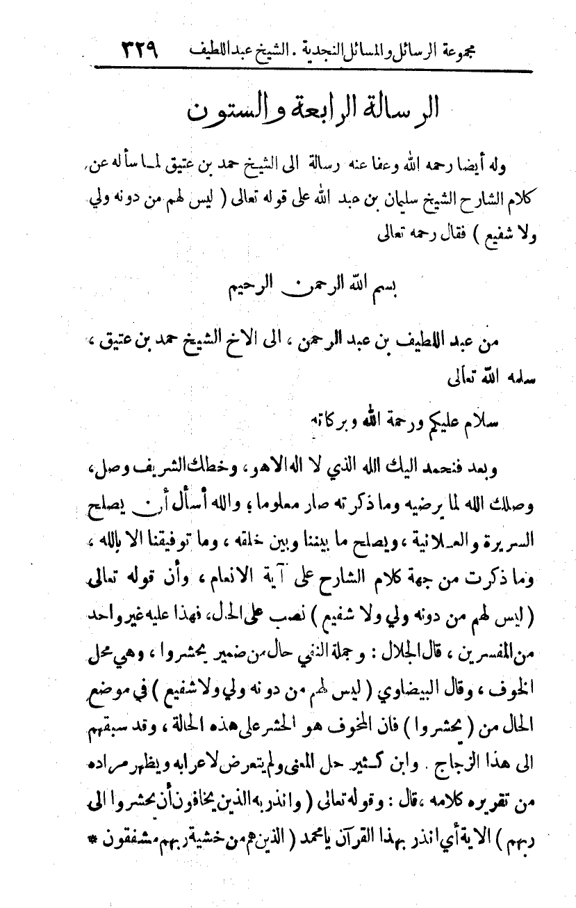 وبعد: فنحمد إليك الله الذي لا إله إلا هو، وخطك الشريف وصل -وصلك الله لما يرضيه- وما ذكرته صار معلوما؛ والله أسأل أن يصلح السريرة والعلانية، ويصلح ما بيننا وبين خلقه، وما توفيقنا إلا بالله. وما ذكرت من جهة كلام الشارح على آية الأنعام، وأن قوله-تعالى-: {لَيْسَ لَهُمْ مِنْ دُونِهِ وَلِيٌّ وَلا شَفِيعٌ} 2 نصب على الحال، فهذا عليه غير واحد من المفسرين: قال الجلال: وجملة النفي حال من ضمير يحشروا، وهي محل الخوف. وقال البيضاوي: {لَيْسَ لَهُمْ مِنْ دُونِهِ وَلِيٌّ وَلا شَفِيعٌ} 3 في موضع الحال من (يحشروا)؛ فإن المخوف هو الحشر على هذه الحالة. وقد سبقهم إلى هذا الزجاج، وابن كثير حلّ المعنى ولم يتعرض لإعرابه، ويظهر مراده من تقريره كلامه، قال: وقوله تعالى: {وَأَنْذِرْ بِهِ الَّذِينَ يَخَافُونَ أَنْ يُحْشَرُوا إِلَى رَبِّهِمْ} 4 الآية، أي: أنذر بهذا القرآن يا محمد {الَّذِينَ هُمْ مِنْ خَشْيَةِ رَبِّهِمْ مُشْفِقُونَ} 5