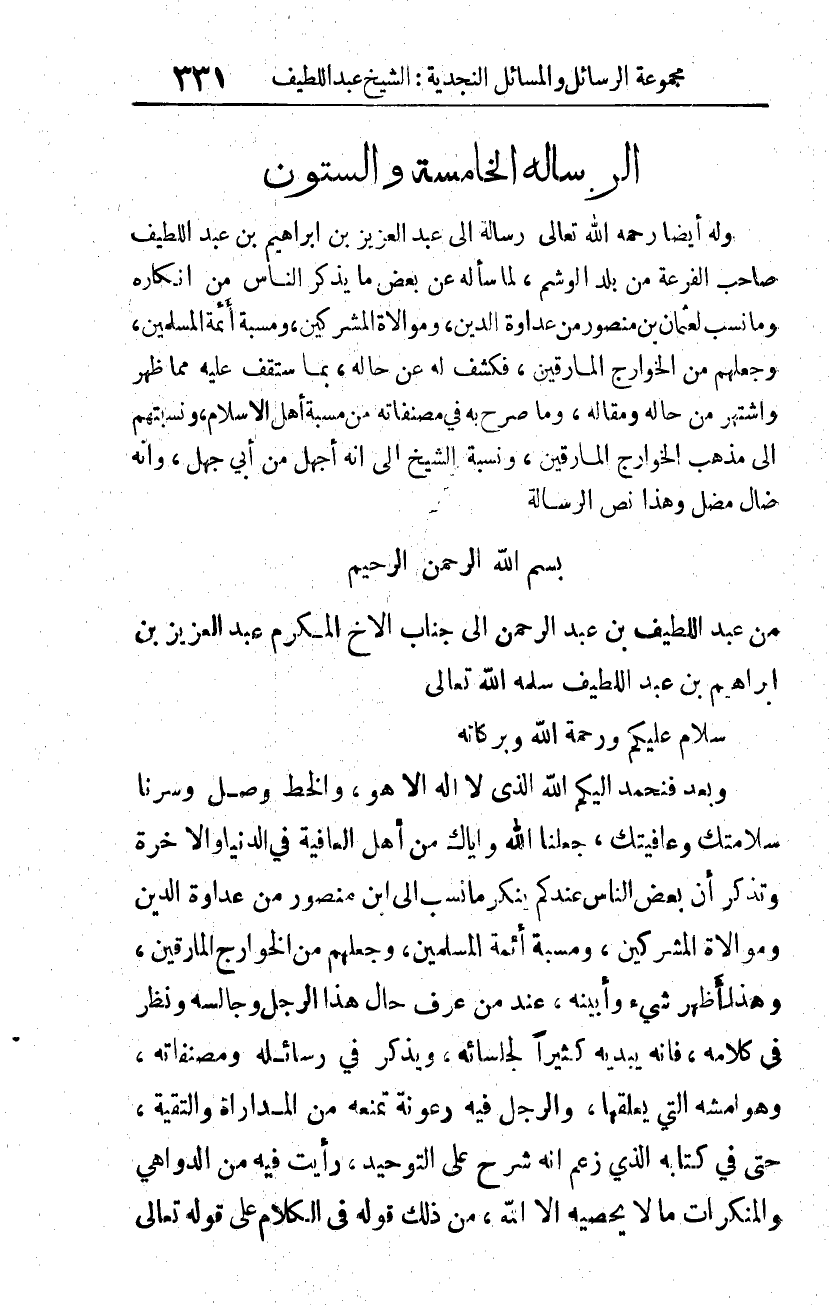 من عبد اللطيف بن عبد الرحمن إلى جناب الأخ المكرم عبد العزيز بن إبراهيم بن عبد اللطيف -سلمه الله تعالى-.