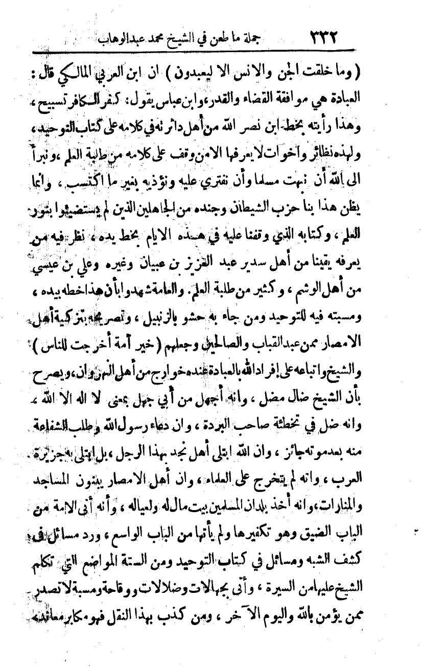 {وَمَا خَلَقْتُ الْجِنَّ وَالأِنْسَ إِلَّا لِيَعْبُدُونِ} 1 أن ابن العربي المالكي قال: العبادة هي موافقة القضاء والقدر، وابن عباس يقول: كفر الكافر تسبيح، وهذا رأيته بخط ابن نصر الله من أهل دائرته في كلامه على كتاب التوحيد؛ ولهذه نظائر وأخوات لا يعرفها إلا من وقف على كلامه من طلبة العلم، ونبرأ إلى الله أن نبهت مسلما، وأن نفتري عليه ونؤذيه بغير ما اكتسب، وإنما يظن هذا بنا حزب الشيطان وجنده من الجاهلين الذين لم يستضيئوا بنور العلم، وكتابه الذي وقفنا عليه في هذه الأيام بخط يده، نظر فيه من يعرفه يقينا من أهل سدير عبد العزيز بن عبيان وغيره وعلي بن عيسى من أهل الوشم. وكثير من طلبة العلم والعامة شهدوا بأن هذا خطه بيده، ومسبته فيه للتوحيد ومن جاء به حشو بالزنبيل، وتصريحه بتزكية أهل الأمصار ممن عبَدَ القباب والصالحين، وجعلهم: {خَيْرَ أُمَّةٍ أُخْرِجَتْ لِلنَّاسِ} 2، والشيخ وأتباعه على إفراد الله بالعبادة عنده خوارج من أهل النهروان. ويصرح بأن الشيخ ضال مضل، وأنه أجهل من أبي جهل بمعنى لا إله إلا الله، وأنه ضل في تخطئة صاحب البردة، وأن دعاء رسول الله وطلب الشفاعة منه بعد موته جائز، وأن الله ابتلى أهل نجد بهذا الرجل، بل ابتلى به جزيرة العرب، وأنه لم يتخرج على العلماء، وأن أهل الأمصار يبنون المساجد والمنارات، وأنه أخذ بلدان المسلمين بيت مال له ولعياله، وأنه أتى الأمة من الباب الضيق وهو تكفيرها، ولم يأتها من الباب الواسع. ورد مسائل في كشف الشبه ومسائل في كتاب التوحيد، ومن الستة المواضع التي تكلم الشيخ عليها من السيرة، وأتى بجهالات وضلالات، ووقاحة ومسبة لا تصدر ممن يؤمن بالله واليوم الآخر؛ ومن كذب بهذا النقل فهو مكابر معاند،