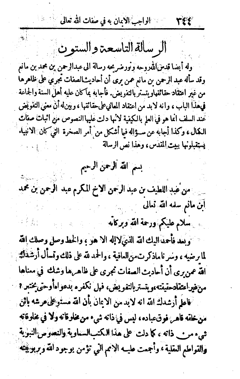 وله أيضا -قدس الله روحه، ونور ضريحه- رسالة إلى عبد الرحمن بن محمد بن مانع، وقد سأله عبد الرحمن بن مانع عمن يرى أن أحاديث الصفات تجري على ظاهرها من غير اعتقاد حقائقها ويتستر بالتفويض، فأجابه بما كان عليه أهل السنة والجماعة في هذا الباب، وأنه لا بد من اعتقاد المعاني على حقائقها. وبيّن له أن معنى التفويض عند السلف إنما هو في العلم بالكيفية؛ لأنها دلت عليها النصوص من إثبات صفات الكمال. وكذا أجابه عن سؤاله فيما أشكل من أمر الصخرة التي كان الأنبياء يستقبلونها ببيت المقدس. وهذا نص الرسالة: