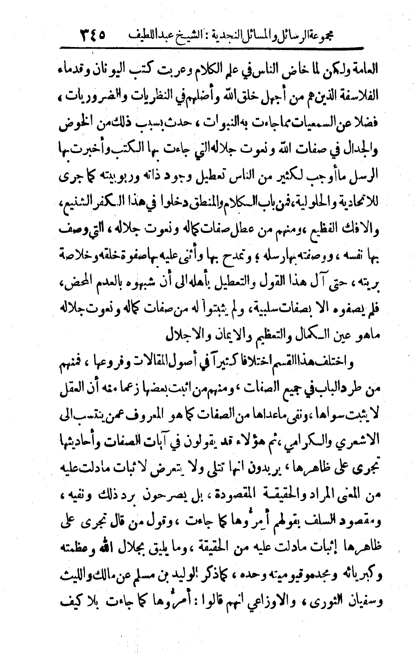 العامة، ولكن لما خاض الناس في علم الكلام، وعربت كتب اليونان وقدماء الفلاسفة الذين هم من أجهل خلق الله، وأضلهم في النظريات والضروريات، فضلا عن السمعيات مما جاءت به النبوات، حدث بسبب ذلك من الخوض والجدال في صفات الله ونعوت جلاله التي جاءت بها الكتب، وأخبرت بها الرسل، ما أوجب لكثير من الناس تعطيل وجود ذاته وربوبيته كما جرى للاتحادية والحلولية. فمن باب الكلام والمنطق دخلوا في هذا الكفر الشنيع، والإفك الفظيع، ومنهم من عطل صفات كماله ونعوت جلاله، التي وصف بها نفسه، ووصفته بها رسله؛ وتمدح بها، وأثنى عليه بها صفوة خلقه وخلاصة بريته؛ حتى آل هذا القول والتعطيل بأهله إلى أن شبهوه بالعدم المحض، فلم يصفوه إلا بصفات سلبية، ولم يثبتوا له من صفات كماله ونعوت جلاله ما هو عين الكمال والتعظيم والإيمان والإجلال.