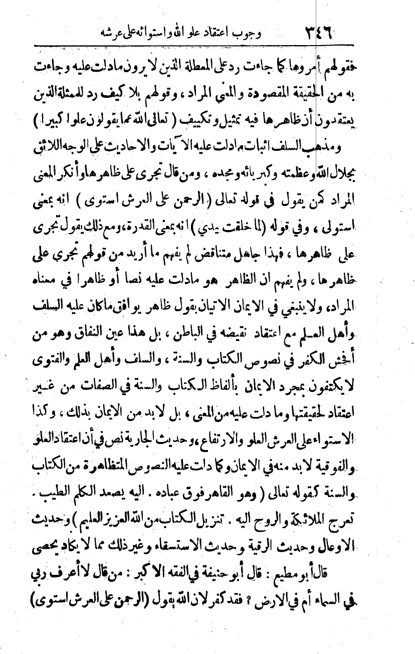 ومذهب السلف: إثبات ما دلت عليه الآيات والأحاديث على الوجه اللائق بجلال الله وعظمته وكبريائه ومجده، ومن قال: تجرى على ظاهرها وأنكر المعنى المراد كمن يقول في قوله -تعالى-: {الرَّحْمَنُ عَلَى الْعَرْشِ اسْتَوَى} 2 أنه بمعنى استولى، وفي قوله: {لِمَا خَلَقْتُ بِيَدَيَّ} 3 أنه بمعنى القدرة، مع ذلك يقول: تجرى على ظاهرها، فهذا جاهل متناقض، لم يفهم ما أريد من قولهم: تجرى على ظاهرها، ولم يفهم أن الظاهر هو ما دلت عليه نصا أو ظاهرا في معناه المراد. ولا ينبغي في الإيمان الإتيان بقول ظاهر يوافق ما كان عليه السلف وأهل العلم، مع اعتقاد نقيضه في الباطن؛ بل هذا عين النفاق، وهو من أفحش الكفر في نصوص الكتاب والسنة. والسلف، وأهل العلم والفتوى لا يكتفون بمجرد الإيمان بألفاظ الكتاب والسنة في الصفات من غير اعتقاد لحقيقتها وما دلت عليه من المعنى؛ بل لا بد من الإيمان بذلك، وكذا الاستواء على العرش العلو والارتفاع. وحديث الجارية نص في أن اعتقاد العلو والفوقية لا بد منه في الإيمان، وكما دلت عليه النصوص المتظاهرة من الكتاب والسنة، كقوله -تعالى-: {وَهُوَ الْقَاهِرُ فَوْقَ عِبَادِهِ} 4، {إِلَيْهِ يَصْعَدُ الْكَلِمُ الطَّيِّبُ} 5، {تَعْرُجُ الْمَلائِكَةُ وَالرُّوحُ إِلَيْهِ} 6، {تَنْزِيلُ الْكِتَابِ مِنَ اللَّهِ الْعَزِيزِ الْعَلِيمِ} 7، وحديث الأوعال، وحديث الرقية، وحديث الاستسقاء، وغير ذلك مما لا يكاد يحصى.