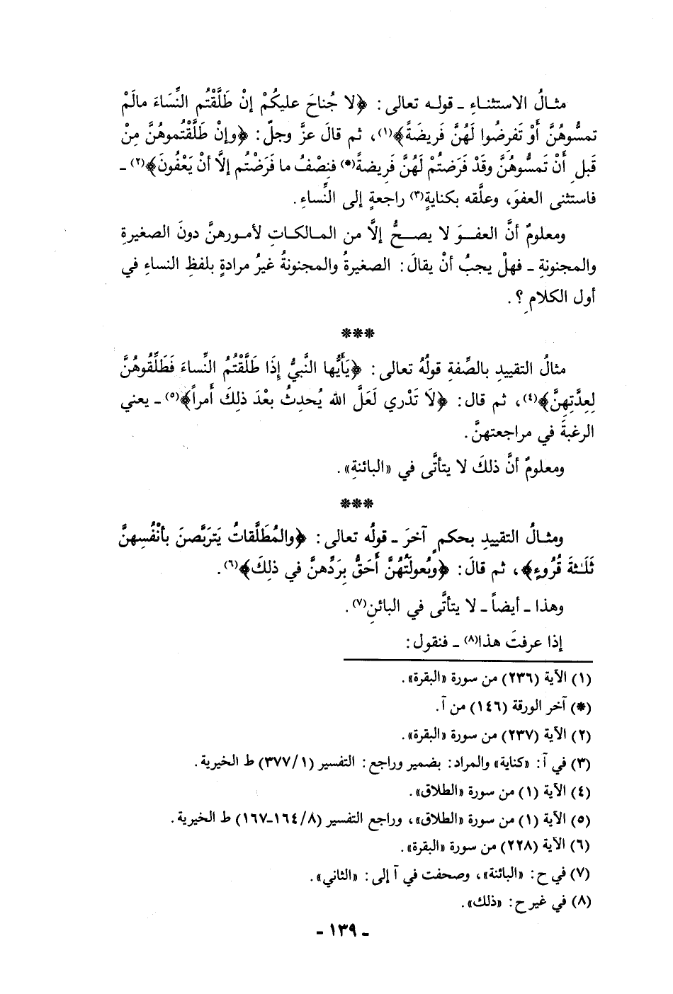 مثال الاستثناء قوله تعالى لا جناح عليكم إن طلقتم النساء ما لم تمسوهن أو تفرضوا لهن فريضة ثم قال عز وجل وإن طلقتموهن من قبل أن تمسوهن وقد فرضتم لهن فريضة فنصف ما فرضتم إلا أن يعفون فاستثنى العفو وعلقه بكناية راجعة إلى النساء ومعلوم أن العفو لا يصح إلا من المالكات لأمورهن دون الصغيرة والمجنونة فهل يجب أن يقال الصغيرة والمجنونة غير مرادة بلفظ النساء في أول الكلام مثال التقييد بالصفة قوله تعالى يا أيها النبي إذا طلقتم النساء فطلقوهن لعدتهن ثم قال لا تدري لعل الله يحدث بعد ذلك أمرا يعني الرغبة في مراجعتهن ومعلوم أن ذلك لا يتأتى في البائنة ومثال التقييد بحكم آخر قوله تعالى والمطلقات يتربصن بأنفسهن ثلاثة قروء ثم قال وبعولتهن أحق بردهن في ذلك وهذا أيضا لا يتأتى في البائن