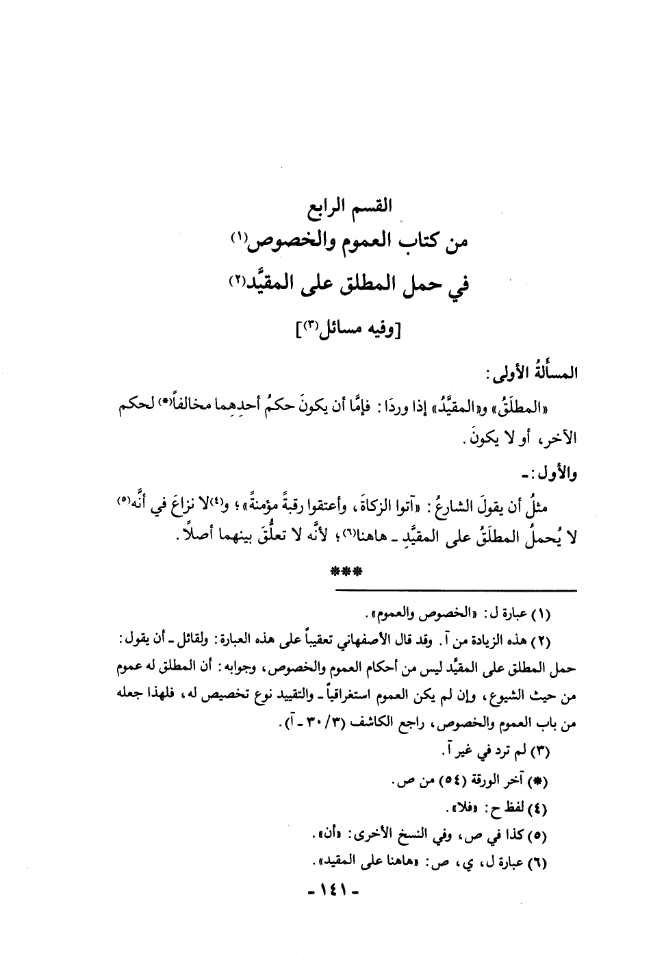 القسم الرابع من كتاب العموم والخصوص في حمل المطلق على المقيد وفيه مسائل المسألة الأولى المطلق والمقيد إذا وردا فإما أن يكون حكم أحدهما مخالفا لحكم الآخر أو لا يكون