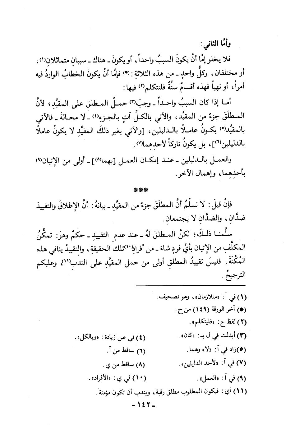 وأما الثاني فلا يخلو إما ان يكون السبب واحدا أو يكون هناك سببان متماثلان أو مختلفان وكل واحد من هذه الثلاثة فإما أن يكون الخطاب الوارد فيه أمرا أو نهيا فهذه أقسام ستة فلنتكلم فيها أما إذا كان السبب واحدا وجب حمل المطلق على المقيد لأن المطلق جزء من المقيد والآتي بالكل آت بالجزء لا محالة فالآتي بالمقيد يكون عاملا بالدليلين والآتي بغير ذلك المقيد لا يكون عاملا بالدليلين بل يكون تاركا لأحدهما والعمل بالدليلين عند إمكان العمل بهما أولى من الإتيان بأحدهما وإهمال الآخر فإن قيل لا نسلم أن المطلق جزء من المقيد بيانه أن الإطلاق والتقييد ضدان والضدان لا يجتمعان سلمنا ذلك لكن المطلق له عند عدم التقييد حكم وهو تمكن المكلف من الإتيان بأي فرد شاء من أفراد تلك الحقيقة والتقييد ينافي هذه المكنة فليس تقييد المطلق أولى من حمل المقيد على الندب وعليكم الترجيح