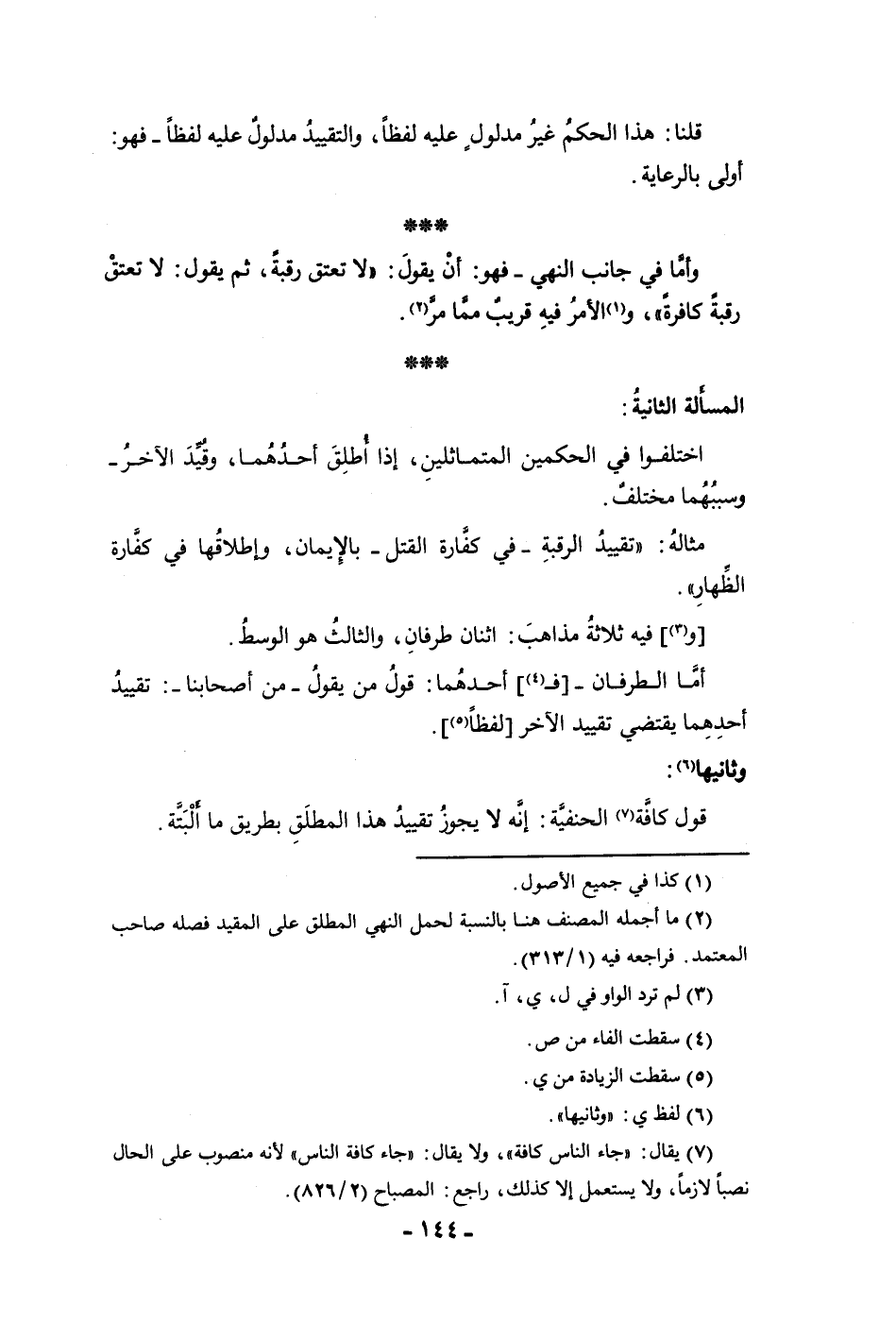 قلنا هذا الحكم غير مدلول عليه لفظا والتقييد مدلول عليه لفظا فهو أولى بالرعاية وأما فجانب النهي فهو أن يقول لا تعتق رقبة ثم يقول لا تعتق رقبة كافرة والأمر فيه قريب مما مر المسألة الثانية اختلفوا في الحكمين المتماثلين إذا أطلق أحدهما وقيد الآخر