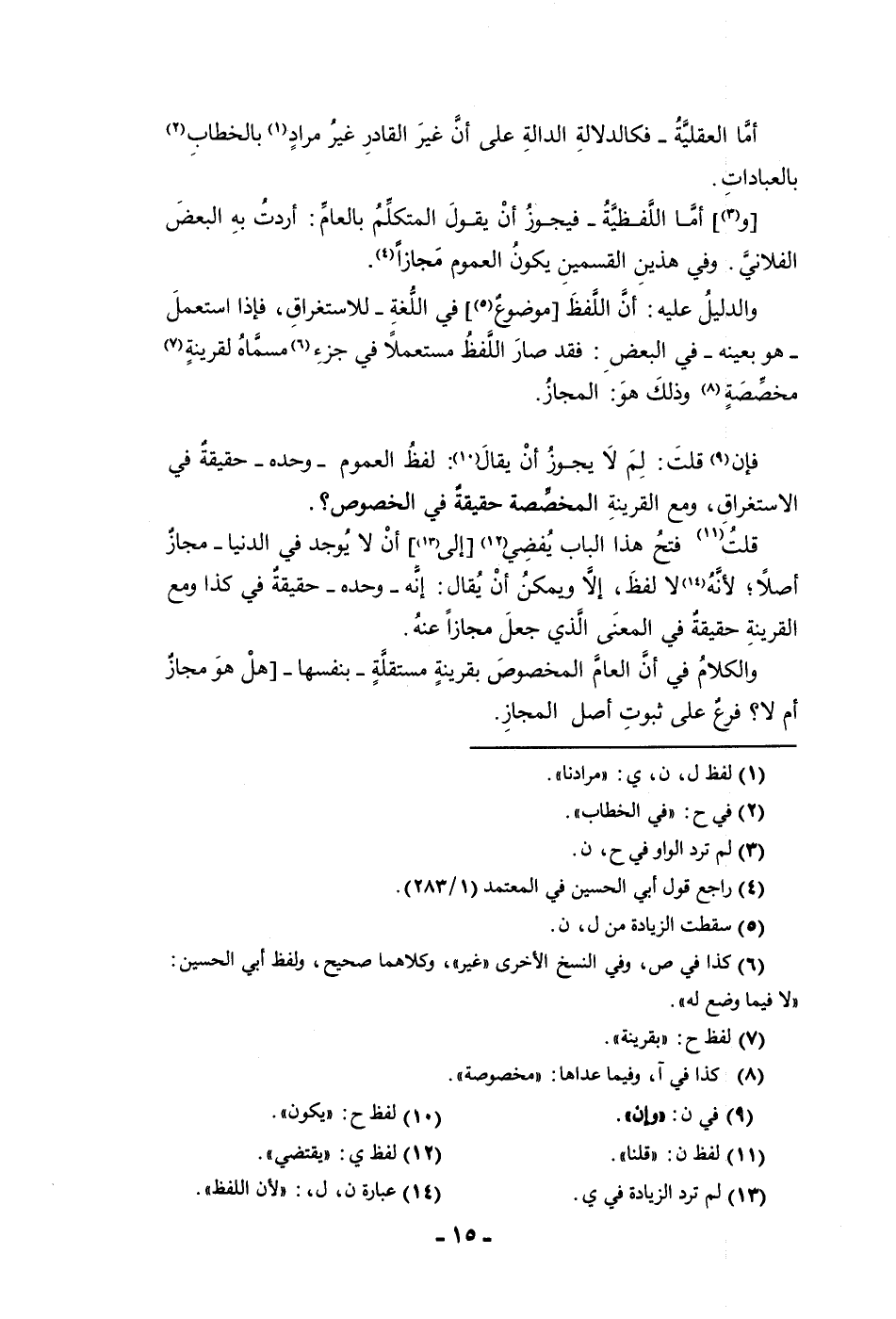 أما العقلية فكالدلالة قال الدالة على أن غير القادر غير مراد بالخطاب بالعبادات وأما اللفظية فيجو أن يقول المتكلم بالعام أردت به البعض