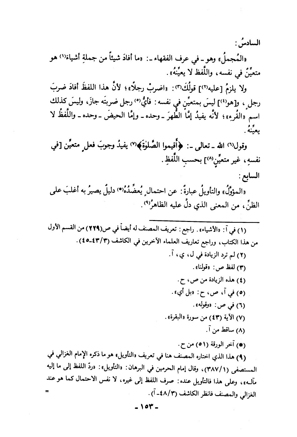السادس المجمل وهو في عرف الفقهاء ما أفاد شيئا من جملة أشياء هو متعين في نفسه واللفظ لا يعينه ولا يلزم عليه قولك اضرب رجلا لأن هذا اللفظ أفاد ضرب رجل وهو ليس بمتعين في نفسه فأي رجل ضربته جاز وليس كذلك اسم القرء لأنه يفيد إما الطهر وحده وإما الحيض وحده واللفظ لا يعينه وقول الله تعالى أقيموا الصلاة يفيد وجوب فعل متعين في نفسه غير متعين بحسب اللفظ السابع المؤول والتأويل عبارة عن احتمال يعضده دليل يصير به أغلب على الظن من المعنى الذي دل عليه الظاهر