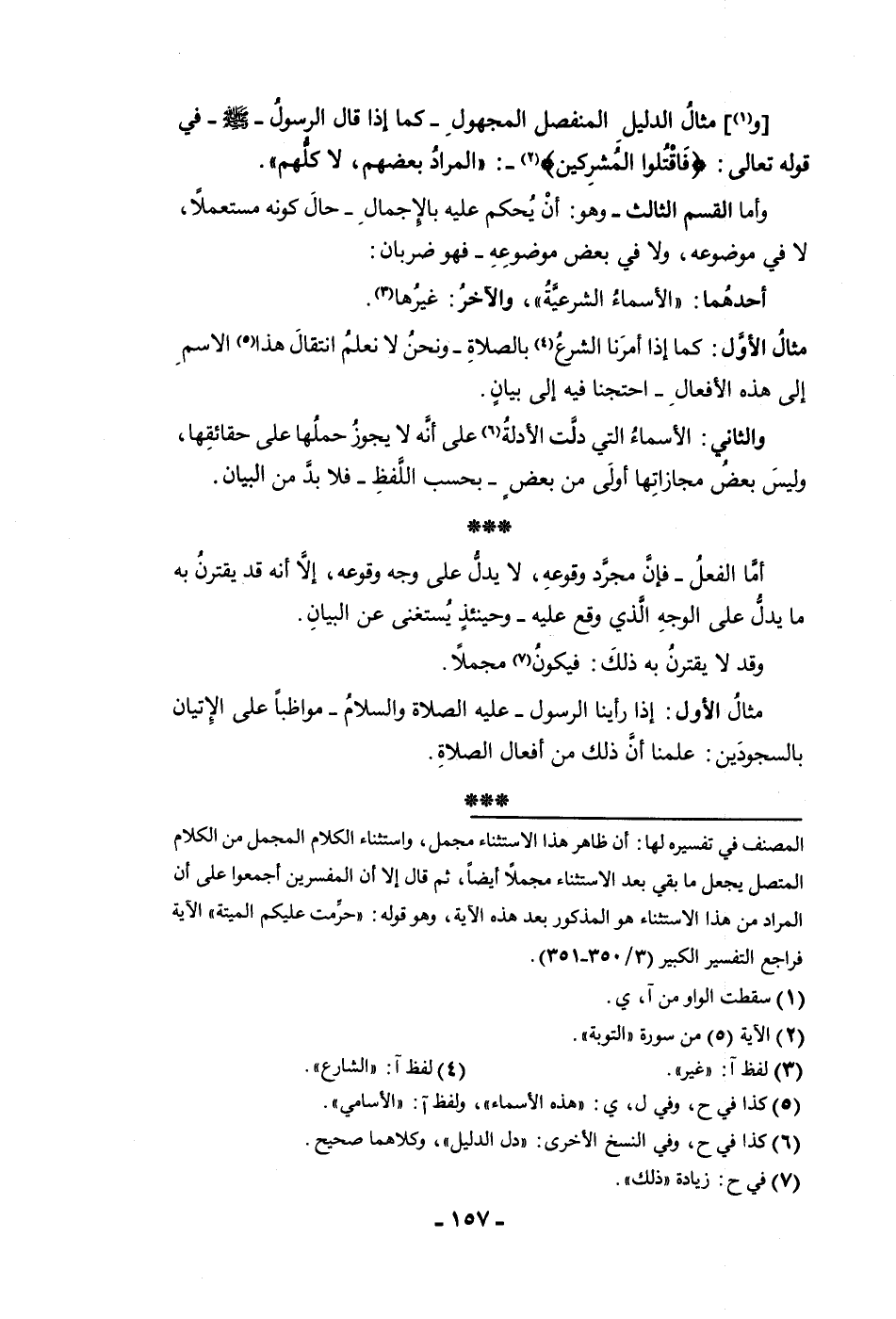 قوله تعالى اقتلوا المشركين المراد بعضهم لا كلهم وأما القسم الثالث وهو أن يحكم عليه بالإجمال حال كونه مستعملا لا في موضوعه ولا في بعض موضوعه فهو ضربان أحدهما الأسماء الشرعية والآخر غيرها مثال الأول كما إذا أمرنا الشرع بالصلاة ونحن وفي لا نعلم انتقال هذا الاسم إلى هذه الأفعال احتجنا فيه إلى بيان والثاني الأسماء التي دلت الأدلة على إنه لا يجوز حملها على حقائقها وليس بعض مجازاتها أولى من بعض بحسب اللفظ فلا بد من البيان أما الفعل فإن مجرد وقوعه لا يدل على وجه وقوعه إلا أنه قد يقترن به ما يدل على الوجه الذي وقع عليه وحينئذ يستغنى عن البيان وقد لا يقترن به ذلك فيكون مجملا مثال الأول إذا رأينا الرسول عليه الصلاة والسلام مواظبا على الإتيان بالسجودين علمنا أن ذلك من أفعال الصلاة