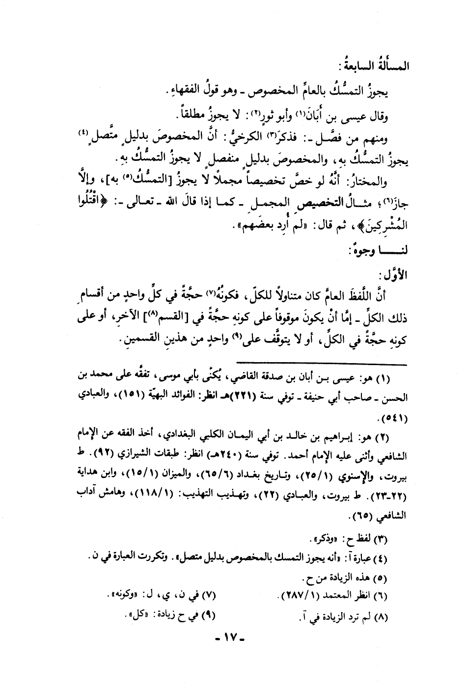 المسألة السابعة يجوز التمسك بالعام المخصوص وهو قول الفقهاء وقال عيسى بن أبان وأبو ثور لا يجوز مطلقا ومنهم من فصل فذكر الكرخي أن المخصوص بدليل متصل يجوز التمسك به والمخصوص بدليل منفصل لا يجوز التمسك به والمختار أنه لو خص تخصيصا مجملا لا يجوز التمسك به وإلا جاز مثال التخصص المجمل كما إذا قال الله تعالى أقتلوا المشركين ثم قال لم أرد بعضهم لنا وجوه الأول أن اللفظ العام كان متناولا للكل فكونه حجة في كل واحد من أقسام ذلك الكل إما أن يكون موقوفا على كونه حجة في القسم الآخر أو على كونه حجة في الكل أو لا يتوقف على واحد من هذين القسمين