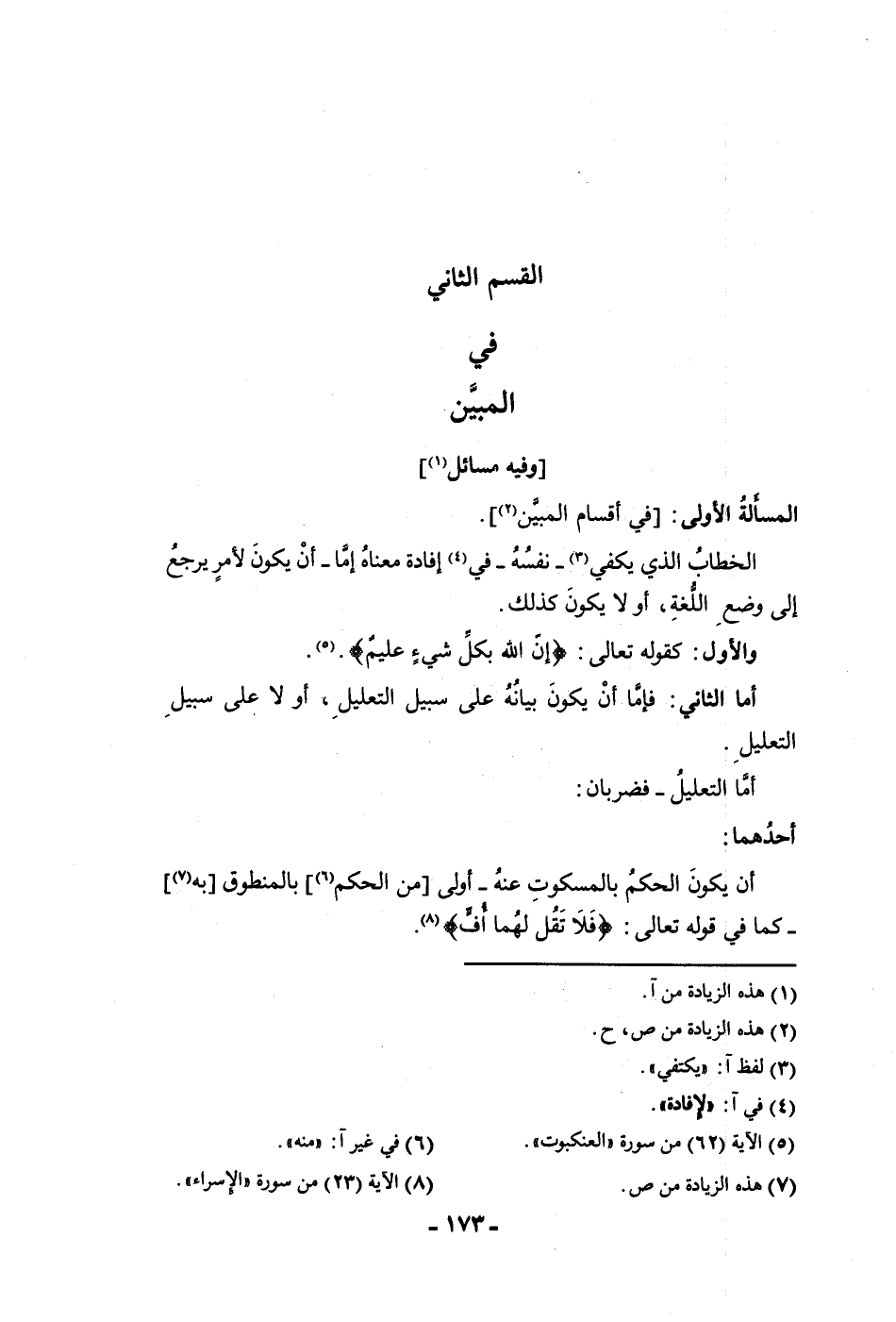 القسم الثاني في المبين وفيه مسائل المسألة الأولى في أقسام المبين الخطاب الذي يكفي نفسه في إفادة معناه إما أن يكون لأمر يرجع إلى وضع اللغة أو لا يكون كذلك والأول كقوله تعالى أن الله بكل شئ عليم أما الثاني فإما أن يكون بيانه على سبيل التعليل أولا على سبيل التعليل