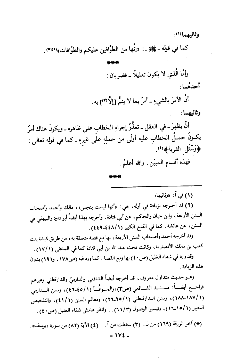 وثانيهما كما في قوله ص إنها من الطوافين عليكم والطوافات وأما الذي لا يكون تعليلا فضربان أحدهما أن الأمر بالشئ أمر بما لا يتم إلا به وثانيهما أن يظهر في العقل تعذر إجراء الخطاب على ظاهره ويكون هناك أمر يكون حمل الخطاب عليه أولى من حمله على غيره كما في قوله تعالى واسأل القرية فهذه أقسام المبين والله أعلم