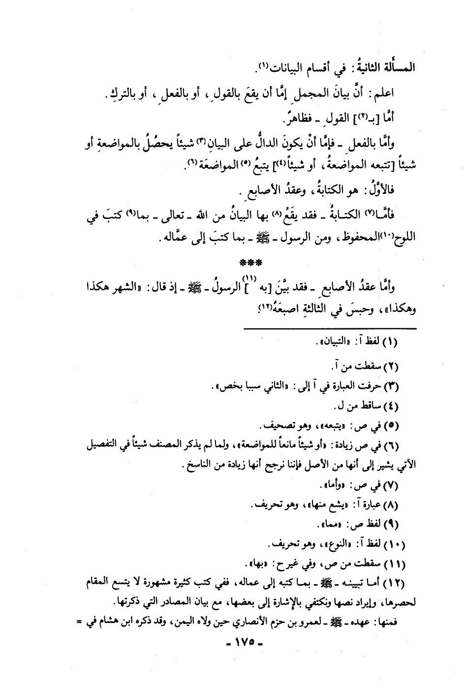 فأما الكتابة فقد يقع بها البيان من الله تعالى بما كتب في اللوح المحفوظ ومن الرسول ص بما كتب إلى عماله وأما عقد الأصابع فقد بين به الرسول ص إذ قال الشهر هكذا وهكذا وحبس في الثالثة أصبعه