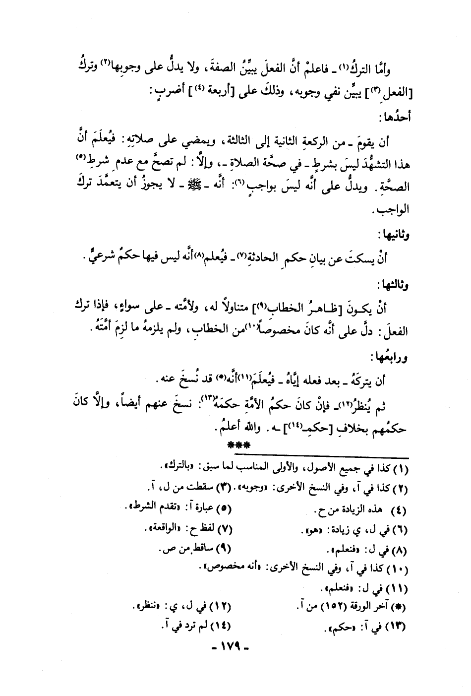 وأما الترك فاعلم أن الفعل يبين الصفة ولا يدل على وجوبها وترك الفعل يبين نفي وجوبه وذلك على أربعة أضرب أحدها أن يقول من الركعة الثانية إلى الثالثة ويمضي على صلاته فيعلم أن هذا التشهد ليس بشرط في صحة الصلاة وإلا لم تصح مع عدم شرط الصحة ويدل على أنه ليس بواجب أنه ص لا يجوز أن يتعمد ترك الواجب وثانيها أن يسكت عن بيان حكم الحادثة فيعلم أنه ليس فيه حكم شرعي وثالثها أن يكون ظاهر الخطاب متناولا له ولأمته على سواء فإذا ترك الفعل دل على أنه كان مخصوصا من الخطاب ولم يلزمه ما لزم أمته ورابعها أن يتركه بعد فعله إياه فيعلم أنه قد نسخ عنه ثم ينظر فإن كان حكم الأمة حكمه نسخ عنهم أيضا وإلا كان حكمهم بخلاف حكمه والله أعلم