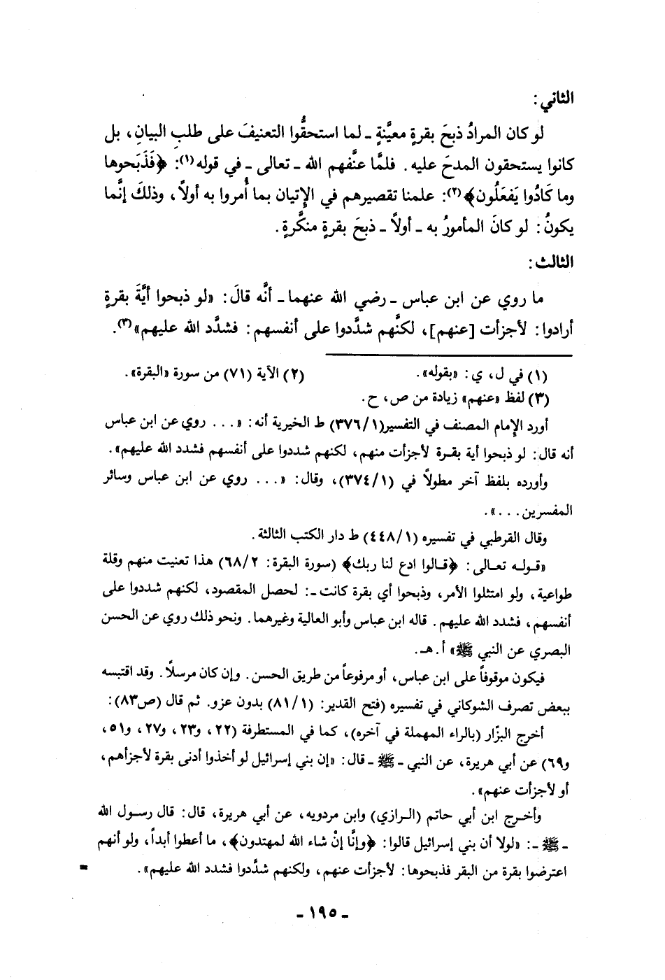 لو كان المراد ذبح بقرة معينة لما استحقوا التعنيف على طلب البيان بل كانوا يستحقون المدح عليه فلما عنفهم اللتعالى في قوله فذبحوها وما كادوا يفعلون علمنا تقصيرهم في الإتيان بما أمروا به أولا وذلك إنما يكون لو كان المأمور به أولا ذبح بقرة منكرة الثالث ما روي عن ابن عباس رضي الله عنهما أنه قال لو ذبحوا أية بقرة أرادوا لأجزأت عنهم لكنهم شددوا على أنفسهم فشدد الله عليهم