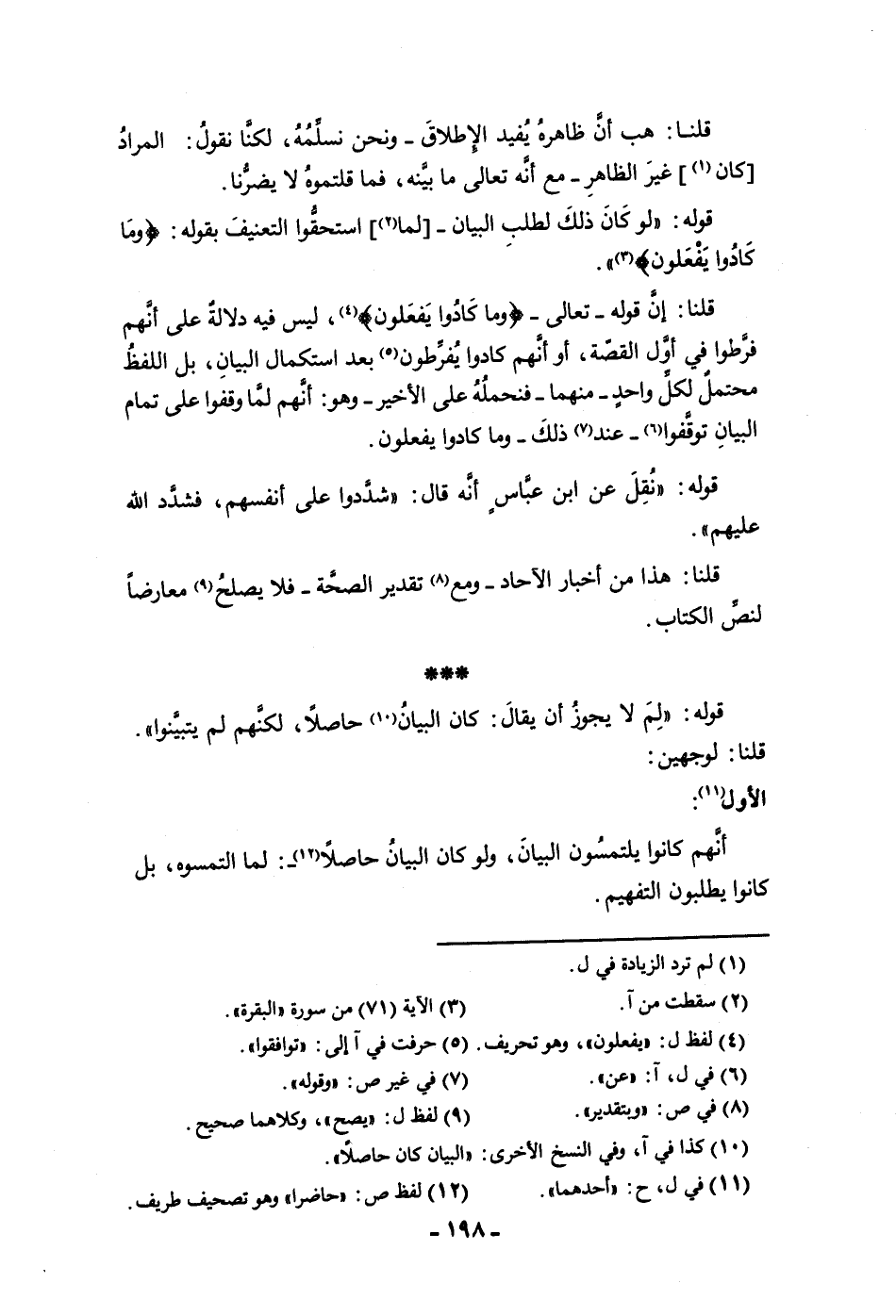 قلنا إن قوله تعالى وما كادوا يفعلون ليس فيه دلالة على أنهم فرطوا في أول القصة أو أنهم كادوا يفرطون بعد استكمال البيان بل اللفظ محتمل لكل واحد منهما فنحمله على الأخير وهو أنهم لما وقفوا على تمام البيان توقفوا عند ذلك وما كادوا يفعلون قوله نقل عن ابن عباس أنه قال شددوا على أنفسهم فشدد الله عليهم قلنا هذا من أخبار الآحاد ومع تقدير الصحة فلا يصلح معارضا لنص الكتاب قوله لم لا يجوز أن يقال كان البيان حاصلا لكنهم لم يتبينوا قلنا لوجهين الآول أنهم كانوا يلتمسون البيان ولكان البيان حاصلا لما التمسوه بل كانوا يطلبون التفهيم