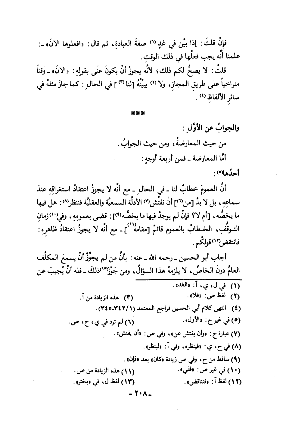 فإن قلت إذا بين في غد صفة العبادة ثم قال افعلوها الآن علمنا أنه يجب فعلها في ذلك الوقت قلت لا يصح لكم ذلك لأنه يجوز أن يكون عنى بقوله الآن وقتا متراخيا حتى على طريق المجاز ولا يبينه لنا في الحال كما جاز مثله في سائر الألفاظ والجواب عن الآول من حيث المعارضة ومن حيث الجواب اما المعارضة فمن ثلاثة أوجه أحدها أن العموم خطاب لنا في الحال مع إنه لا يجوز اعتقاد استغراقه عند سماعه بل لا بد من أن نفتش الأدلة السمعية والعقلية فننظر هل فيها ما يخصه أم لا فإن لو يوجد فيها ما يخصه + قضى بعمومه وفي زمان التوقف الخطاب بالعموم قائم مقامه مع إنه لا يجوز اعتقاد ظاهره فانتقض قولكم أجاب أبو الحسين رحمه الله عنه بأن من لم يجوز أن يسمع الكلف