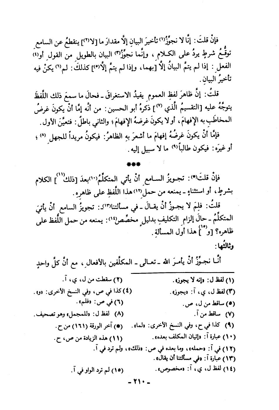 تأخير البيان قلت إن ظاهر لفظ العموم يفيد الاستغراق فحال ما سمع ذلك اللفظ يتوجه عليه التقسيم الذي ذكره أبو الحسين من أنه إما أن يكون غرض المخاطب به الإفهام أو لا يكون غرضه الإفهام والثاني باطل فتعين الأول فإما أن يكون غرضه إفهام ما أشعر به الظاهر فيكون مريدا للجهل أو غيره فيكون طالبا ما لا سبيل إليه فإن قلت تجويز السامع أن يأتي المتكلم بعد ذلك الكلام بشرط أو استثناء يمنعه من حمل هذا اللفظ على ظاهره قلت فلم لا يجوز أن يقال في مسألتنا تجويز السامع أن يأتي المتكلم حال إلزام التكليف بدليل مخصص يمنعه من حمل اللفظ على ظاهره وهذا أول المسألة وثالثها أنا نجوز أن يأمر الله تعالى المكلفين بالأفعال مع أن كل واحد