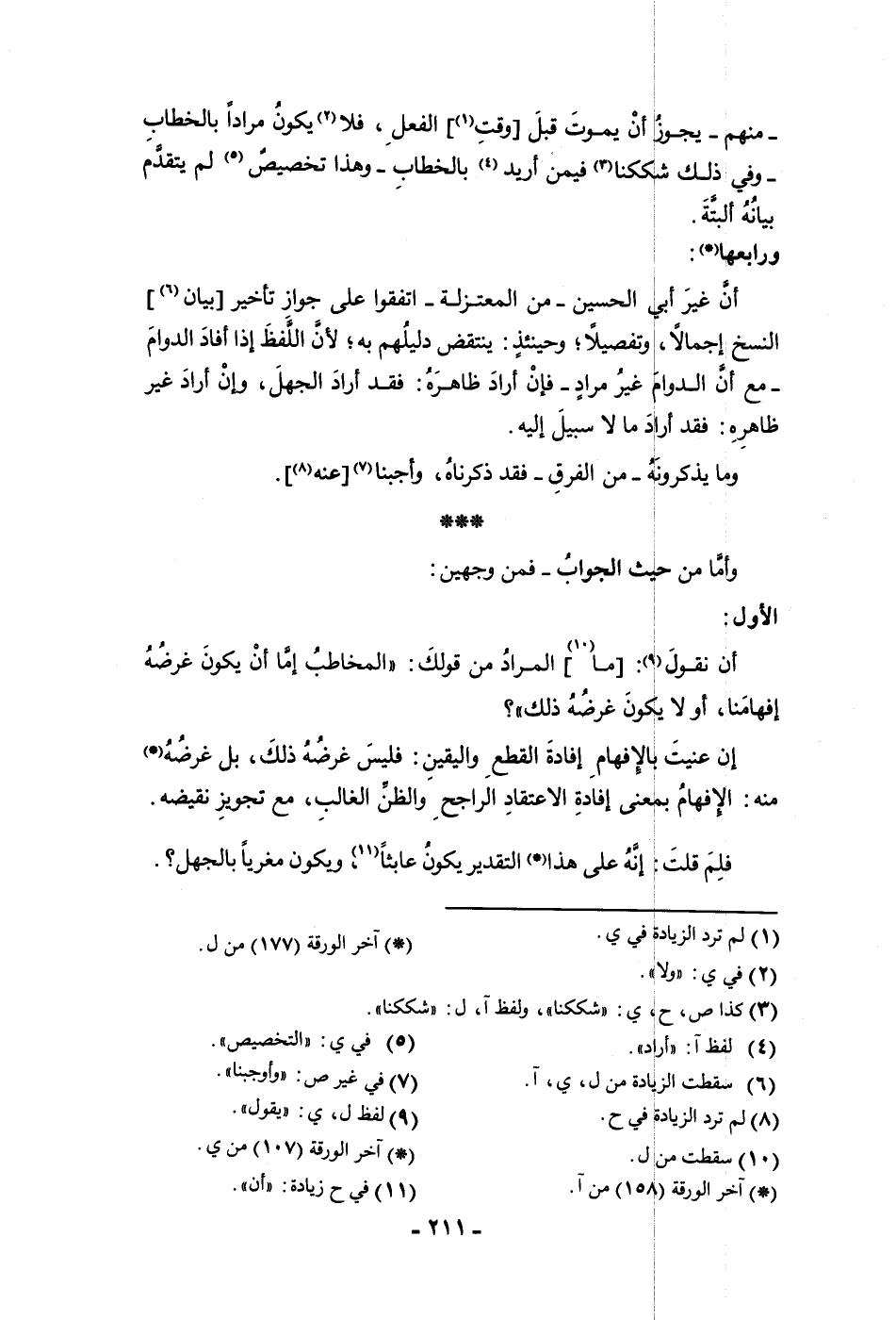 منهم يجوز أن يموت قبل وقت الفعل فلا يكون مرادا بالخطاب وفي ذلك شككنا فيمن أريد بالخطاب وهذا تخصيص لم يتقدم بيانه البتة ورابعها أن غير أبي الحسين من المعتزلة اتفقوا على جواز تأخير بيان النسخ إجمالا وتفصيلا وحينئذ ينتقض دليلهم به لأن اللفظ إذا أفاد الدوام مع أن الدوام غير مراد فإن أراد ظاهره فقد أراد الجهل وإن أراد غير ظاهره فقد أراد ما لاسبيل إليه