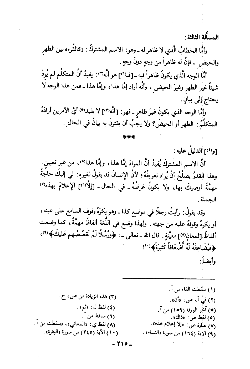 وأما الخطاب الذي لا ظاهر له وهو الاسم المشترك كالقرء بين الطهر والحيض فإن له ظاهرا من وجه دون وجه أما الوجه الذي يكن ظاهرا فيه فهو أنه يفيد أن المتكلم لم يرد شيئا غير الطهر وغير الحيض وأنه أراد إما هذا وإما هذا فمن فإن هذا الوجه لا يحتاج إلى بيان وأما الوجه الذي يكون غير ظاهر فهو أنه لا يفيد أي الأمرين إرادة المتكلم الطهر أو الحيض ولا يجب أن يقترن به بيان في الحال والدليل عليه أن الاسم المشترك يفيد أن المراد إما هذا وإما هذا من غير تعيين وهذا القدر يصلح أن يراد تعريفه لأن الإنسان قد يقول لغيره لي إليك حاجة مهمة أوصيك بها ولا يكون غرضه في الحال إلا الإعلام بهذه الجملة وقد يقول رأيت رجلا في موضع كذا وهو يكره وقوف السامع على عينه أو يكره وقوفه عليه من جهته ولهذا وضع في اللغة ألفاظ مهمة كما وضعت ألفاظ لمعان معينة قال الله تعالى ورسلا لم نقصصهم عليك فيضاعفه له أضعافا كثيرة وأيضا
