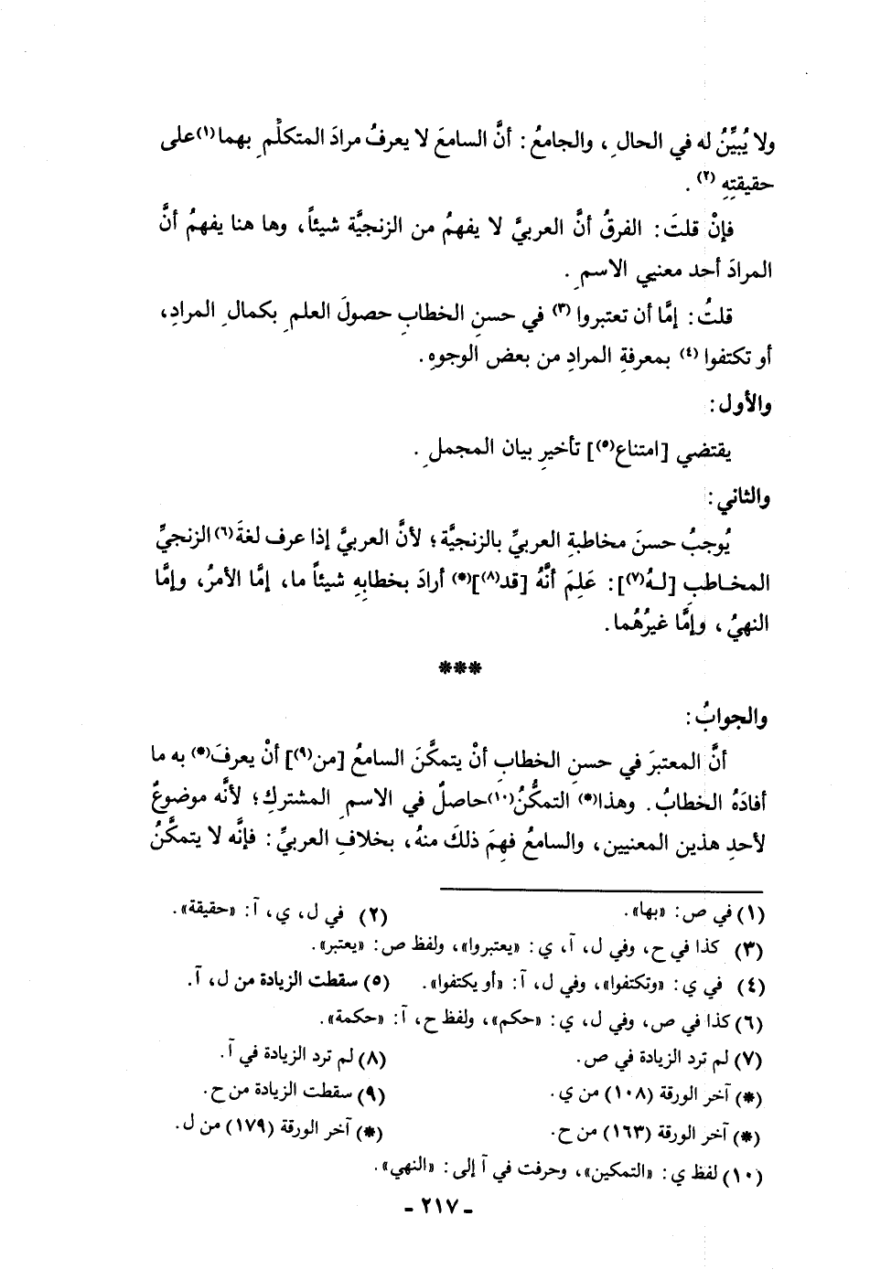 يوجب حسن مخاطبة العربي بالزنجية لأن العربي إذ عرف لغة الزنجي المخاطب له علم أنه قد أراد بخطابه شيئا ما إما الأمر وإما النهي وإما غيرهما والجواب أن المعتبر في حسن الخطاب أن يتمكن السامع من أن يعرف به ما أفاده الخطاب وهذا التمكن حاصل في الاسم المشترك لأنه موضوع لأحد هذين المعنيين والراجع فهم ذلك منه بخلاف العربي فإنه لا يتمكن