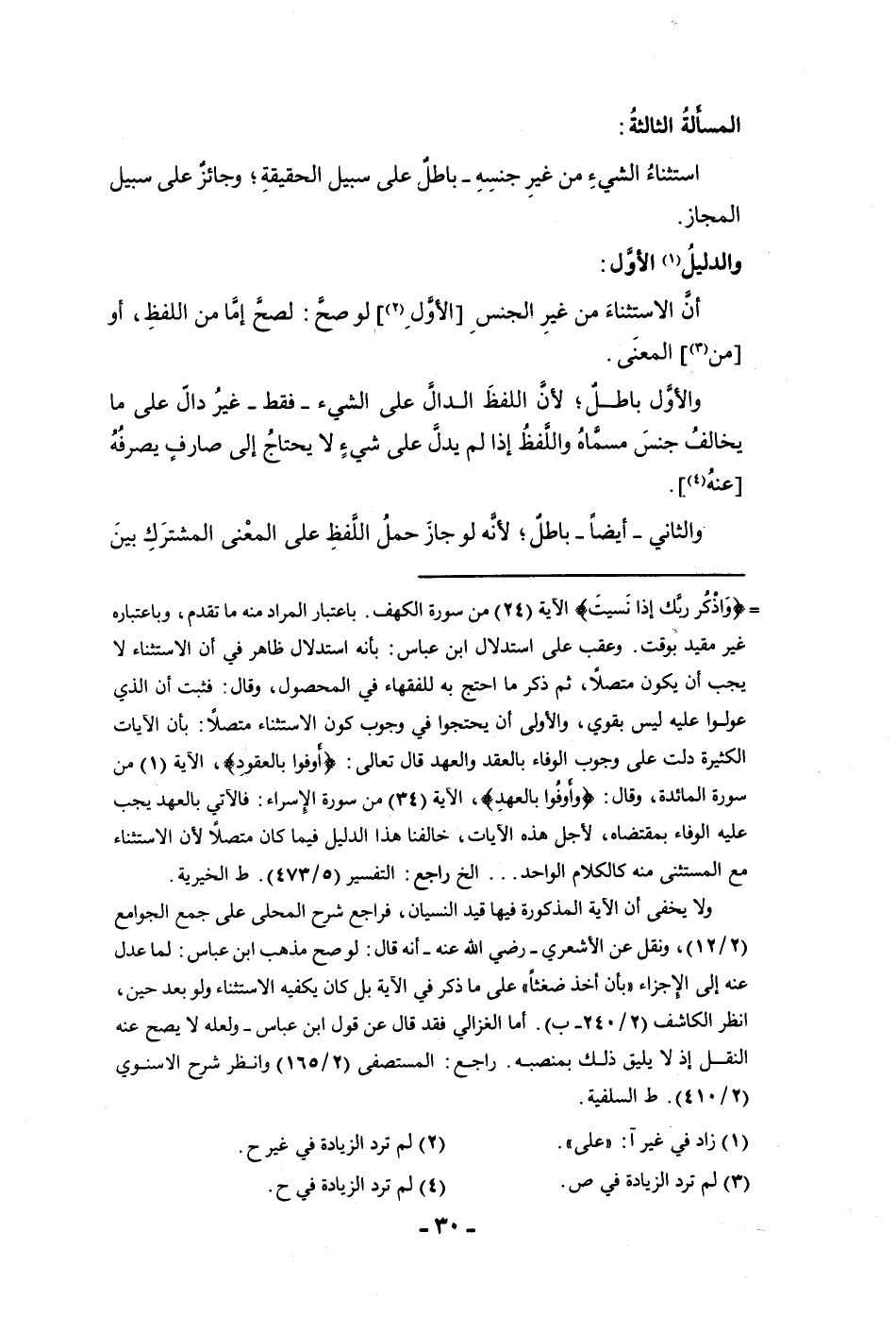 المسألة الثالثة استثناء الشئ من غير جنسه باطل على سبيل الحقيقة وجائز على سبيل