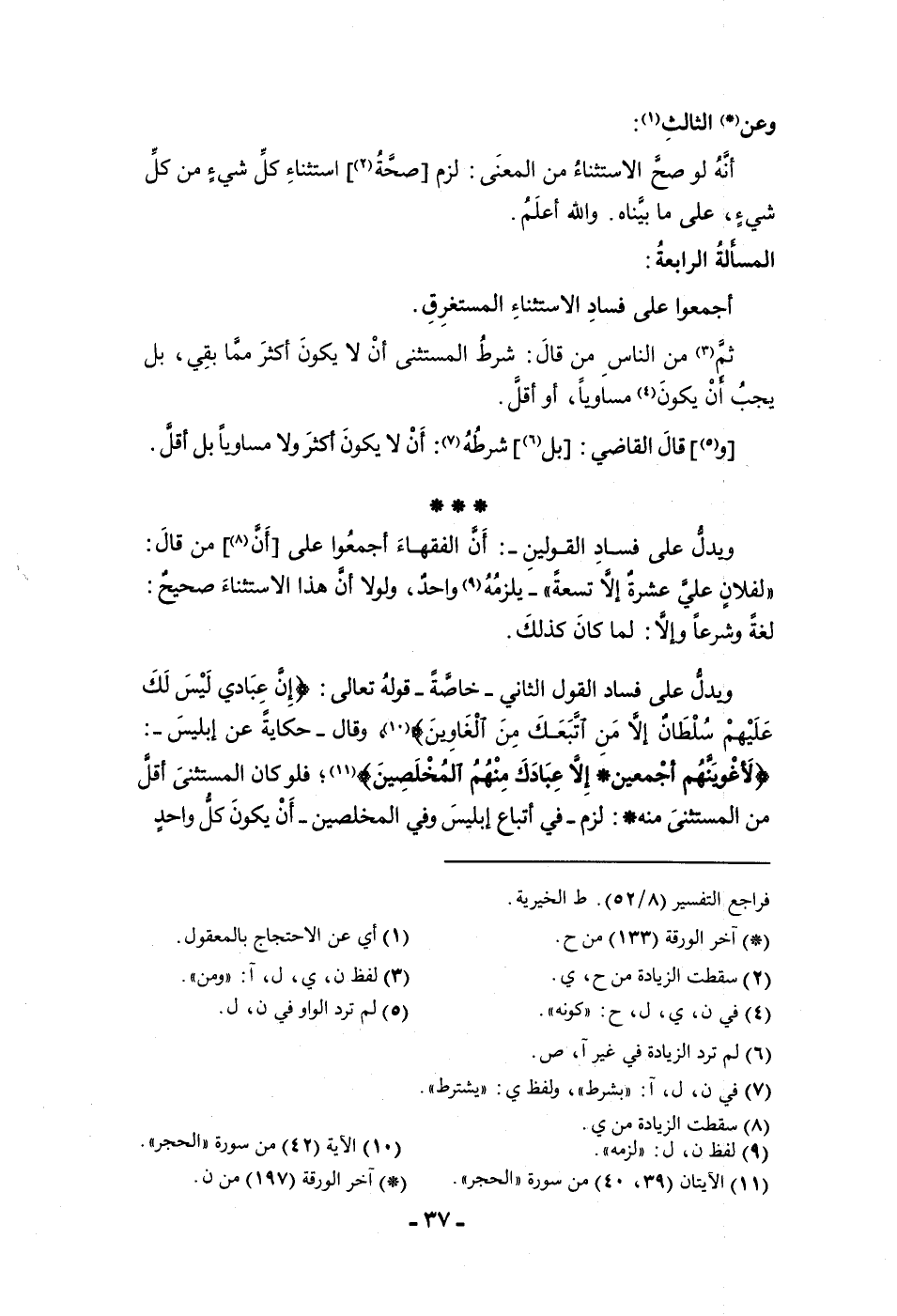 أجمعوا على فساد الاستثناء المستغرق ثم من الناس من قال شرط المستثنى أن لا يكون أكثر أكثر مما بقي بل يجب أن يكون مساويا أو أقل وقال القاضي بل شرطه أن لا يكون أكثر ولا مساويا سنة بل أقل ويدل على فساد القولين أن الفقهاء أجمعوا على أن من قال لفلان علي عشرة إلا تسعة يلزمه واحد ولولا أن هذا الاستثناء صحيح لغة وشرعا وإلا لمكن كذلك ويدل على فساد اقول الثاني خاصة قوله تعالى إن عبادي ليس لك عليهم سلطان إلا من اتبعك من الغاوين وقال حكاية عن إبليس لأغوينهم أجمعين إلا عبادك منهم المخلصين فلو كان المستثنى أقل من المستثنى منه لزم في أتباع إبليس وفي المخلصين أن يكون كل واحد