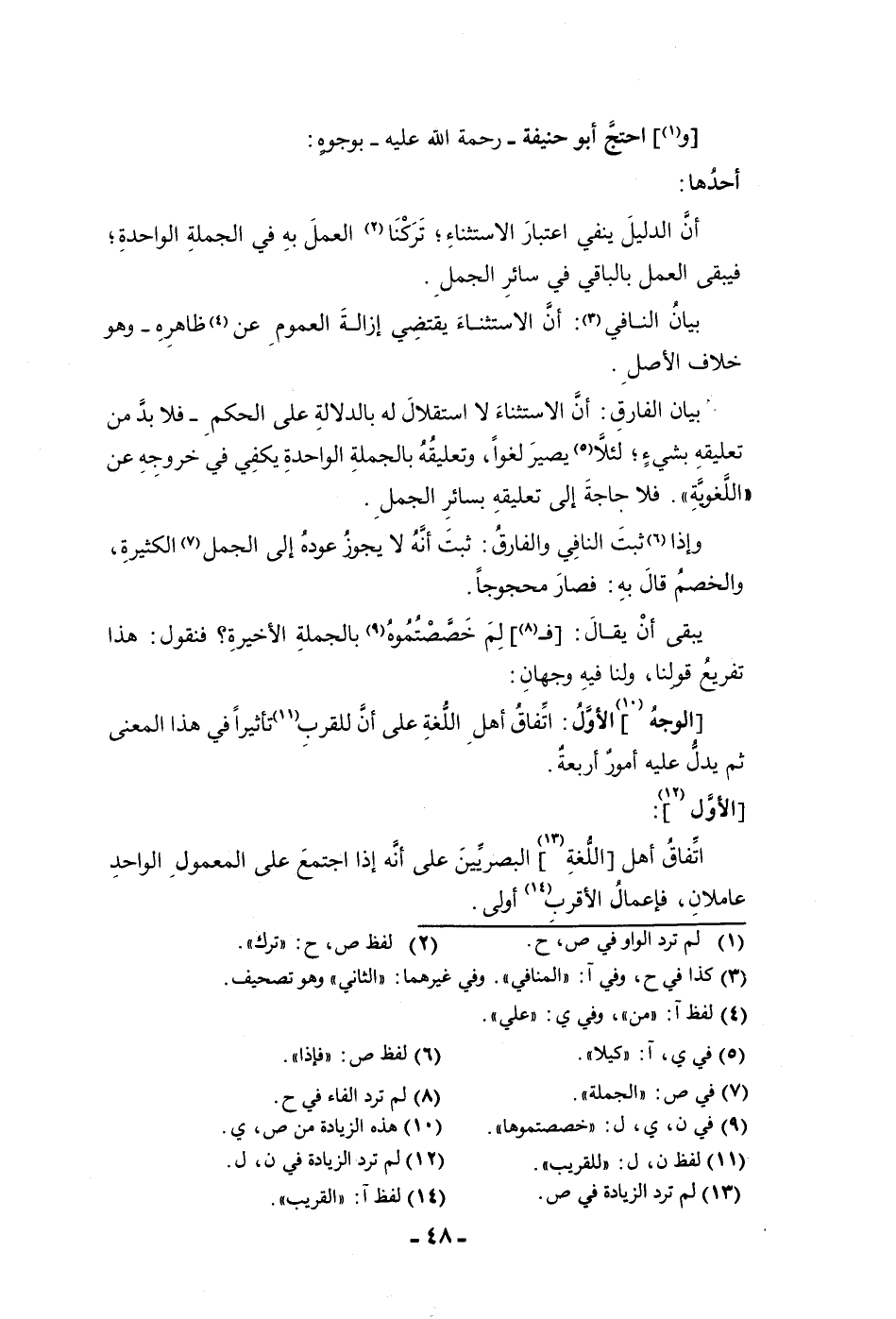 واحتج أبو حنيفة رحمة الله عليه بوجوه أحدها أن الدليل ينفي اعتبار الاستثناء تركنا العمل به في الجملة الواحدة فيبقى العمل بالباقي في سائر الجمل بيان النافي أن الاستثناء يقتضي إزالة العموم عن ظاهره وهو خلاف الأصل بيان الفارق أن الاستثناء لا استقلال له بالدلالة على الحكم فلا بد من تعليقه بشئ لئلا يصير لغوا وتعليقه بالجملة الواحدة يكفي في خروجه عن اللغوية فحاجة إلى تعليقه بسائر الجمل وإذا ثبت النافي والفارق ثبت إنه لا يجوز عوده إلى الجمل الكثيرة والخصم قال به فصار محجوجا يبقى أن يقال لم خصصتموه بالجملة الأخيرة فتقول هذا تفريع قولنا ولنا فيه وجهان الوجه الأول اتفاق أهل اللغة على أن للقرب تأثيرا في هذا المعنى ثم يدل عليه أمور أربعة الأول اتفاق أهل اللغة البصريين على أنه إذا اجتمع على المعمول الواحد عاملان فإعمال الأقرب أولى