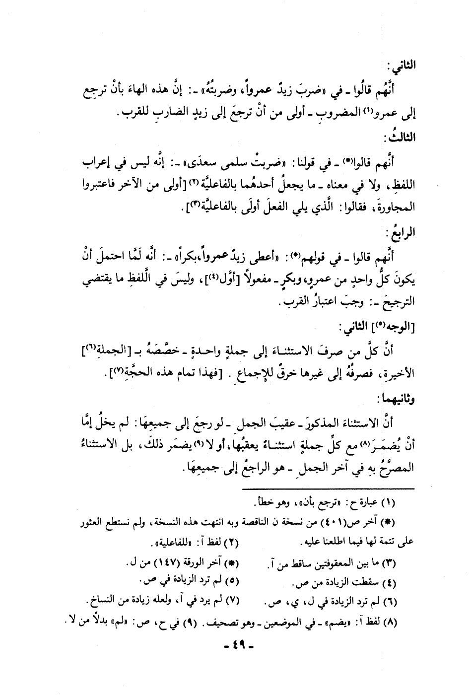 الثاني أنهم قالوا في ضرب زيد عمروا وضربته إن هذه الهاء بأن ترجع إلى عمرو المضروب أولى من أن ترجع إلى زيد الضارب للقرب الثالث أنهم قالو في قولنا ضربت سلمى سعدى إنه ليس في إعراب اللفظ ولا في معناه ما يجعل أحدهما بالفاعلية اولى من الآخر فاعتبروا المجاورة فقالوا الذي يلي الفعل أولى بالفاعلية الرابع أنهم قالوا في قولهم أعطى زيد عمروا بكرا أنه لما احتمل أن يكون وكل واحد من عمر وبكر مفعولا أول وليس في اللفظ ما يقتضي الترجيح وجب اعتبار القرب الوجه الثاني أن كل من صرف الاستثناء إلى جملة واحدة خصصه بالجملة الأخيرة فصرفه إلى غيرها خرق للإجماع فهذا تمام هذه الحجة وثانيهما أن الاستثناء المذكور عقيب الجمل لو رجع إلى جميعها لم يخل إما أن يضمر مع كل جملة استثناء يعقبها أولا يضمر ذلك بل الاستثناء المصرح به في آخر الجمل هو الراجع إلى جميعها
