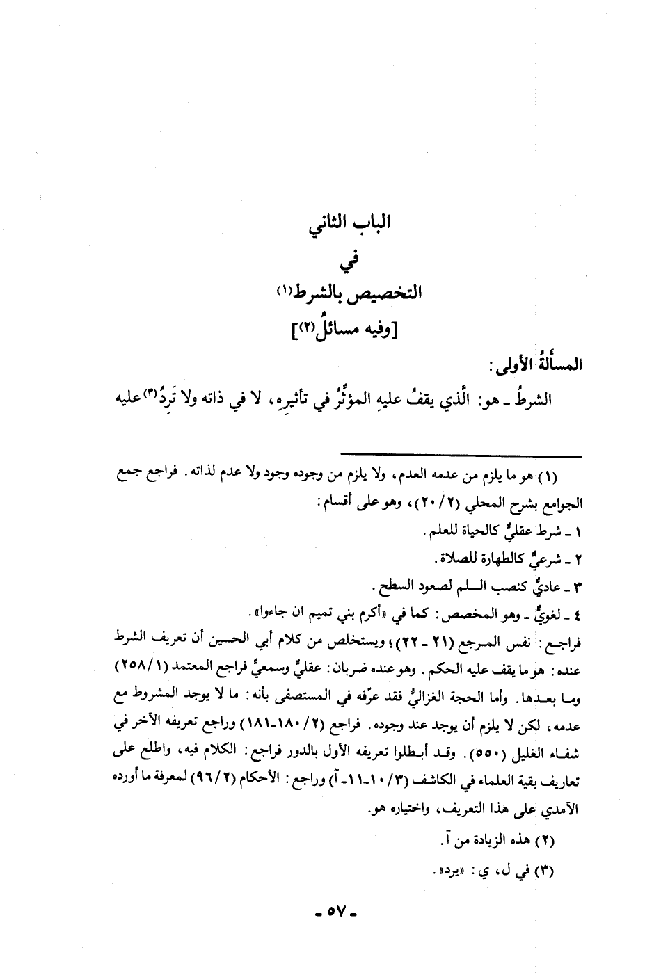 الباب الثاني في التخصيص بالشرط وفيه مسائل المسألة الأولى الشرط هو الذي يقف عليه المؤثر في تأثيره لا في ذاته ولا ترد عليه