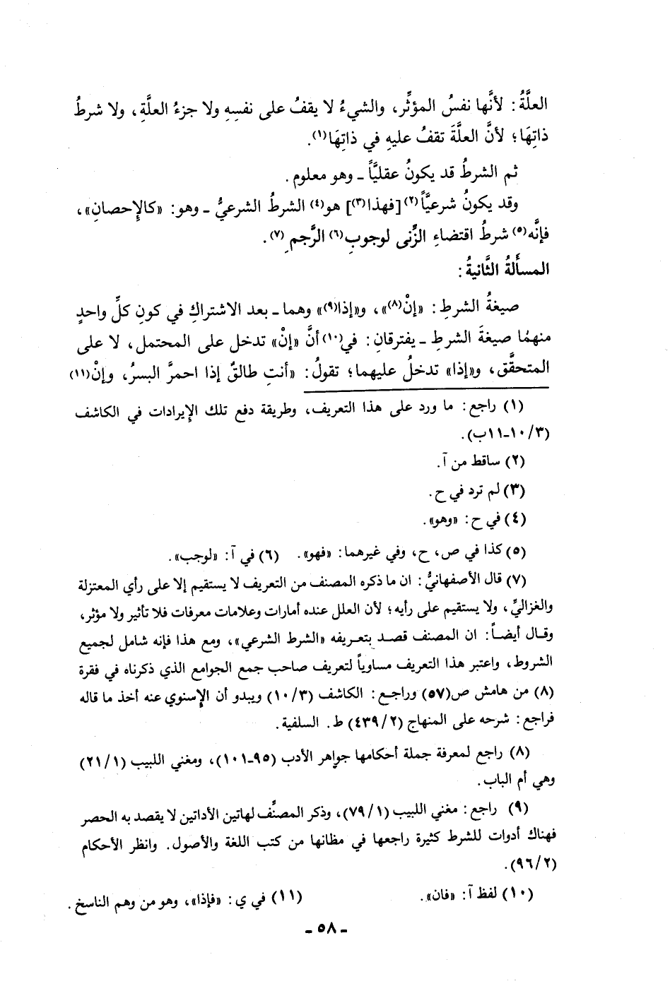 العلة لأنها نفس المؤثر والشئ لا يقف على نفسه ولا جزء العلة ولا شرط ذاتها لأن العلة تقف عليه في ذاتها ثم الشرط قد يكون عقليا وهو معلوم وقد يكون شرعيا فهذا هو الشرط الشرعي وهو كالإحصان فإنه شرط اقتضاء الزنا لوجوب الرجم المسألة الثانية صيغة الشرط إن وإذا وهما بعد الاشتراك في كون كل واحد منهما صيغة الشرط يفترقان في أن إن تدخل على المحتمل لا على المتحقق وإذا تدخل عليهما تقول أنت طالق إذا احمر البسر وإن
