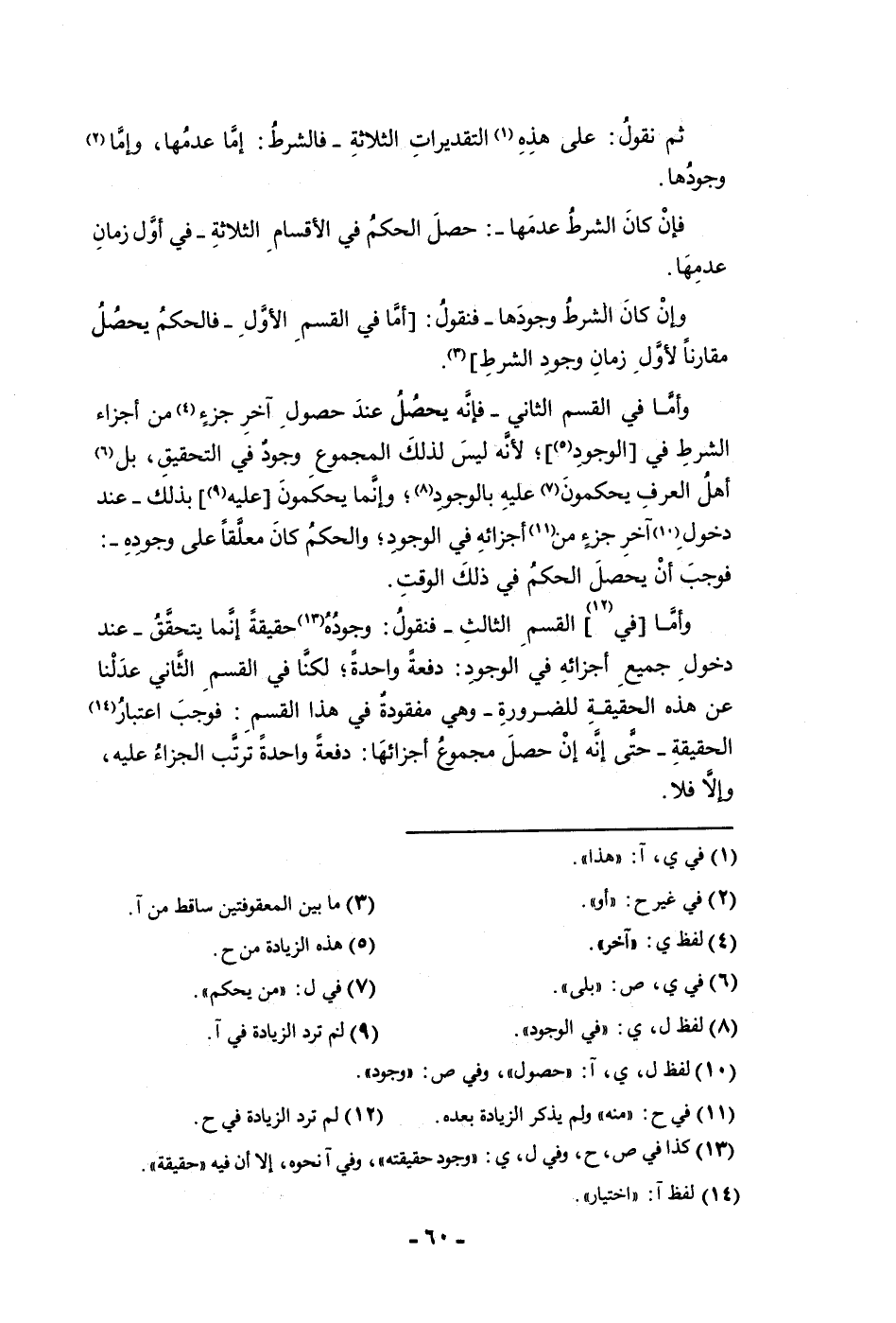 ثم نقول على هذه التقديرات الثلاثة فالشرط إما عدمها وإما وجودها فإن كان الشرط عدمها حصل الحكم في الآقسام الثلاثة في أول زمان عدمها وإن كان الشرط وجودها فنقول أما في القسم الأول فالحكم يحصل مقارنا لأول زمان وجود الشرط وأما في القسم الثاني فإنه يحصل عند حصول آخر جزء من أجزاء الشرط في الوجود لأنه ليس لذلك المجموع وجود في التحقيق بل