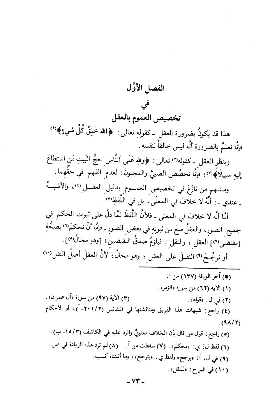 الفصل الأول في تخصيص العموم بالعقل هذا قد يكون بضرورة العقل كقوله تعالى الله خالق كل شئ فإنا نعلم بالضرورة أنه ليس خالقا لنفسه وبنظر العقل كقوله تعالى ولله على الناس حج البيت من استطاع إليه سبيلا فإنا نخصص الصبي والمجنون لعدم الفهم في حقهما