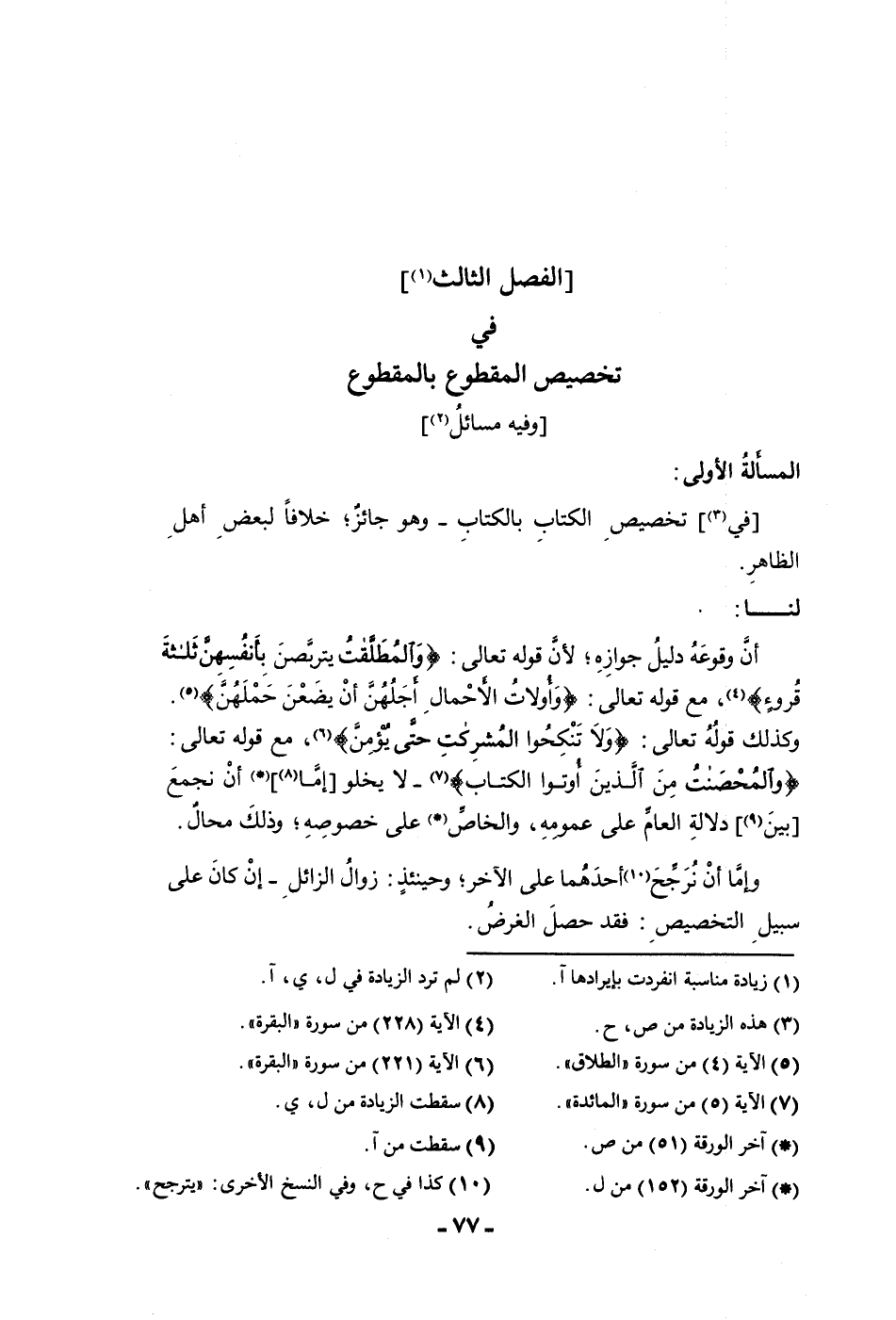الفصل الثالث في تخصيص المقطوع بالمقطوع وفيه مسائل المسألة الأولى في تخصيص الكتاب بالكتاب وهو جائز خلافا لبعض أهل الظاهر لنا إن وقوعه دليل جوازه لأن قوله تعالى والمطلقات يتربصن بأنفسهن ثلاثة قروء مع قوله تعالى وأولات الآحمال حديث أجلهن أن يضعن حملهن وكذلك قوله تعالى ولا تنكحوا المشركات حتى يؤمن مع قوله تعالى والمحصنات من الذين أوتوا الكتاب لا يخلو إما ان نجمع بين دلالة العام على عمومه والخاص على خصوصه وذلك محال وإما أن نرجح أحدهما على الآخر وحينئذ زوال الزائل إن كان على سبيل التخصيص فقد حصل الغرض