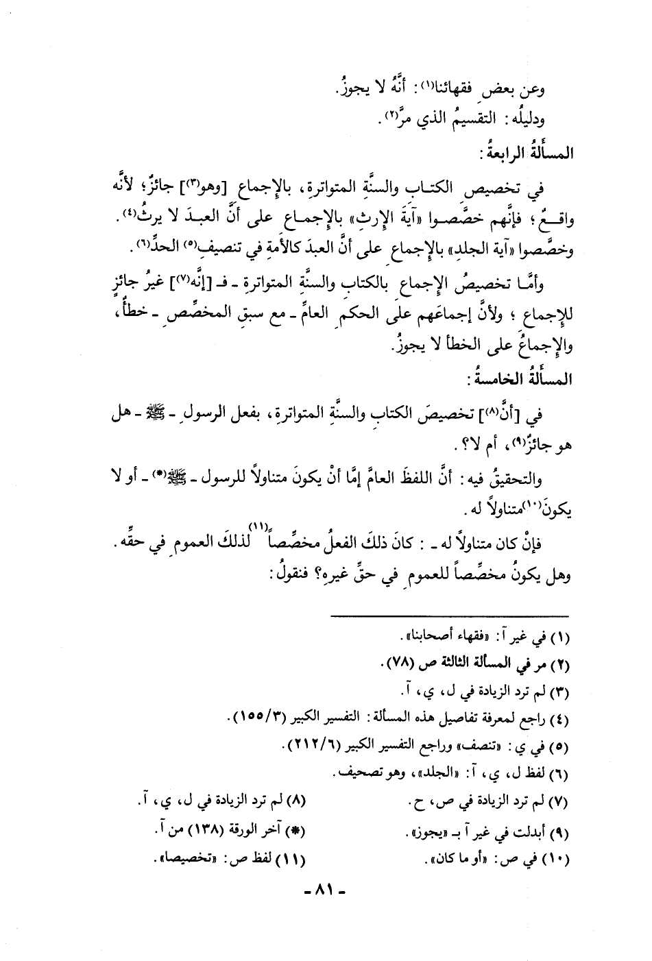 وعن بعض فقهائنا إنه لا يجوز ودليله التقسيم الذي مر المسألة الرابعة في تخصيص الكتاب والسنة المتواترة بالإجماع وهو جائز لأنه واقع فإنهم خصصوا آية الإرث بالإجماع على أن العبد لا يرث وخصصوا آية الجلد بالإجماع على أن العبد كالأمة في تنصيف الحد وأما تخصيص الإجماع بالكتاب والسنة المتواترة ف إنه غير جائز للإجماع ولأن إجماعهم على الحكم العام مع سبق المخصص خطأ والإجماع على الخطأ لا يجوز المسألة الخامسة في أن تخصيص الكتاب والسنة المتواترة بفعل الرسول ص هل هو جائز أم لا والتحقيق فيه أن اللفظ العام إما أن يكون متناولا للرسول ص أو لا يكون متناولا له فإن كان متناولا له كان ذلك الفعل مخصصا لذلك العموم في حقه وهل يكون مخصصا للعموم في حق غيره فنقول