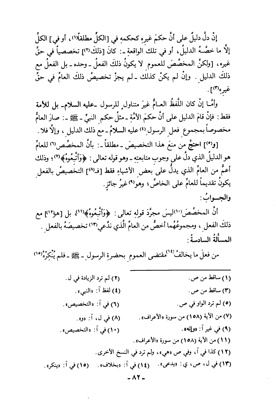ذلك الدليل وإن لم يكن كذلك لم يجز تخصيص ذلك العام في حق غيره وأما إن كان اللفظ العام غير متناول للرسول عليه السلام بل للأمة فقط فإن قام الدليل على أن حكم الأمة مثل حكم النبي ص صار العام مخصوصا بمجموع فعل الرسول عليه السلام مع ذلك الدليل وإلا فلا واحتج من منع هذا التخصيص مطلقا بأن المخصص للعام هو الدليل الذي دل على وجوب متابعته وهو قولتعالى فاتبعوه وذلك اعم من العام الذي يدل على بعض الأشياء فقط فالتخصيص بالفعل يكون تقديما للعام على الخاص وهو غير جائز والجواب أن المخصص ليس مجرد قوله تعالى فاتبعوه بل هو مع ذلك الفعل ومجموعهما أخص من العام الذي ندعي تخصيصه بالفعل المسألة السادسة من فعل ما يخالف مقتضى العموم بحضر الرسول ص فلم ينكره
