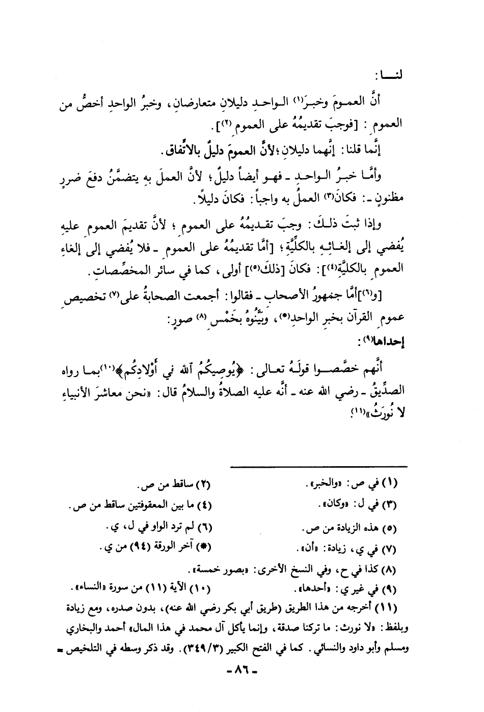 عموم القرآن بخبر الواحد وبينوه بخمس صور إحداها أنهم خصصوا قوله تعالى يوصيكم الله في أولادكم بما رواه الصديق رضي الله عنه أنه عليه الصلاة والسلام قال نحن معاشر الأنبياء لا نورث