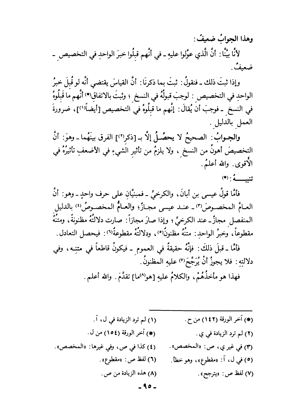 وهذا الجواب ضعيف لأنا بينا أن الذي عولوا عليه في أنهم قبلوا خبر الواحد في التخصيص ضعيف وإذا ثبت ذلك فنقول ثبت بما ذكرنا أن القياس يقتضي أنه لو قبل خبر الواحد في التخصيص لوجب قبوله في النسخ وثبت بالاتفاق أنهم ما قبلوه في النسخ فوجب أن يقال أنهم ما قبلوه في التخصيص أيضا ضروة العمل بالدليل والجواب الصحيح لا يحصل إلا بذكر الفرق بينهما وهو أن التخصيص أهون من النسخ ولا يلزم من تأثير الشئ في الأضعف تأثيره في