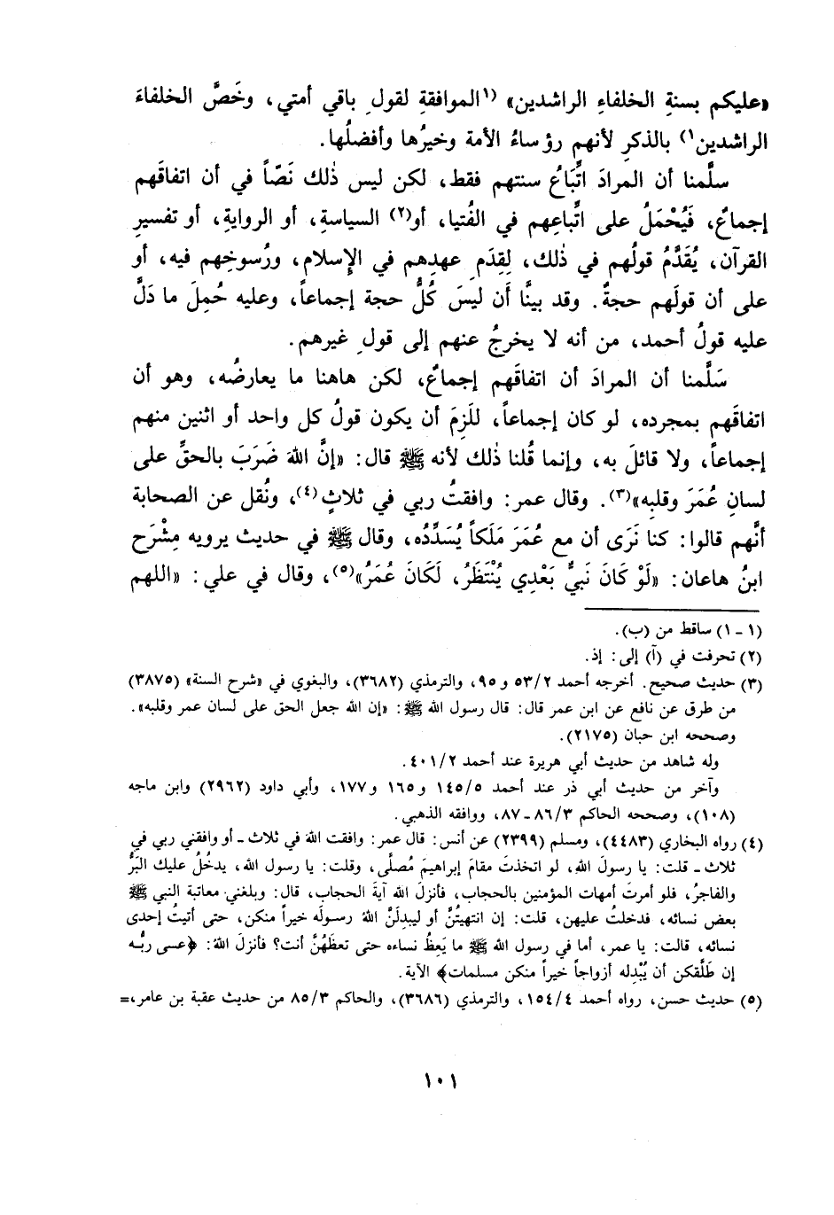 سَلَّمْنَا أَنَّ الْمُرَادَ اتِّبَاعُ سُنَّتِهِمْ فَقَطْ، لَكِنْ لَيْسَ ذَلِكَ نَصًّا فِي أَنَّ اتِّفَاقَهُمْ إِجْمَاعٌ، فَيُحْمَلُ عَلَى اتِّبَاعِهِمْ فِي الْفُتْيَا، أَوِ السِّيَاسَةِ، أَوِ الرِّوَايَةِ، أَوْ تَفْسِيرِ الْقُرْآنِ، يُقَدَّمُ قَوْلُهُمْ فِي ذَلِكَ، لِقِدَمِ عَهْدِهِمْ فِي الْإِسْلَامِ، وَرُسُوخِهِمْ فِيهِ، أَوْ عَلَى أَنَّ قَوْلَهُمْ حُجَّةٌ. وَقَدْ بَيَّنَّا أَنْ لَيْسَ كُلُّ حُجَّةٍ إِجْمَاعًا، وَعَلَيْهِ حُمِلَ مَا دَلَّ عَلَيْهِ قَوْلُ أَحْمَدَ، مِنْ أَنَّهُ لَا يَخْرُجُ عَنْهُمْ إِلَى قَوْلِ غَيْرِهِمْ.