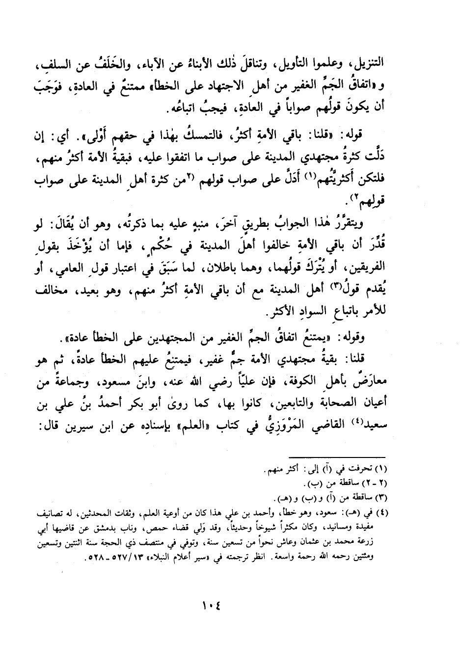 قُلْنَا: بَقِيَّةُ مُجْتَهِدِي الْأُمَّةِ جَمٌّ غَفِيرٌ، فَيَمْتَنِعُ عَلَيْهِمُ الْخَطَأُ عَادَةً، ثُمَّ هُوَ مُعَارَضٌ بِأَهْلِ الْكُوفَةِ، فَإِنَّ عَلِيًّا - رَضِيَ اللَّهُ عَنْهُ -، وَابْنَ مَسْعُودٍ، وَجَمَاعَةً مِنْ أَعْيَانِ الصَّحَابَةِ وَالتَّابِعِينَ، كَانُوا بِهَا، كَمَا رَوَى أَبُو بَكْرٍ أَحْمَدُ بْنُ عَلِيِّ بْنِ سَعِيدٍ الْقَاضِي الْمَرْوَزِيُّ فِي كِتَابِ «الْعِلْمِ» بِإِسْنَادِهِ عَنِ ابْنِ سِيرِينَ قَالَ: