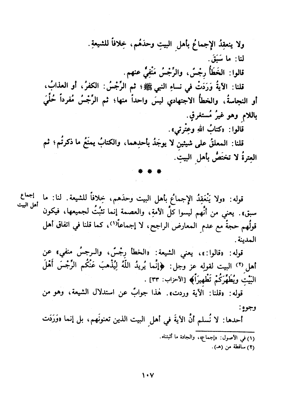 قَوْلُهُ: " قَالُوا: " يَعْنِي الشِّيعَةَ: " الْخَطَأُ رِجْسٌ، وَالرِّجْسُ مَنْفِيٌّ " عَنْ أَهْلِ الْبَيْتِ لِقَوْلِهِ - عَزَّ وَجَلَّ -: {إِنَّمَا يُرِيدُ اللَّهُ لِيُذْهِبَ عَنْكُمُ الرِّجْسَ أَهْلَ الْبَيْتِ وَيُطَهِّرَكُمْ تَطْهِيرًا} [الْأَحْزَابِ: 33] .