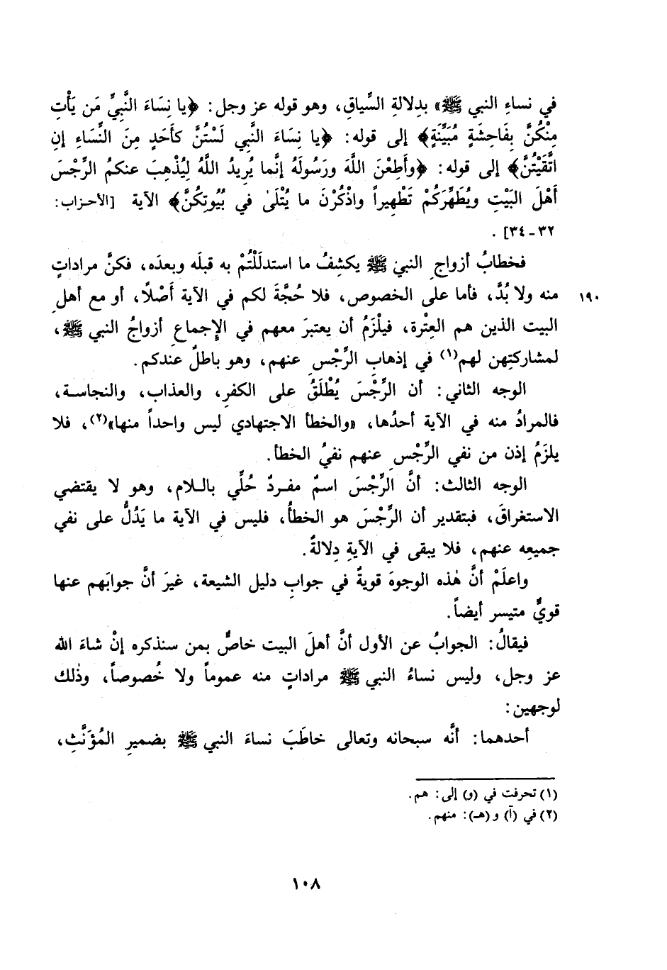فَخِطَابُ أَزْوَاجِ النَّبِيِّ - صَلَّى اللَّهُ عَلَيْهِ وَسَلَّمَ - يَكْشِفُ مَا اسْتَدْلَلْتُمْ بِهِ قَبْلَهُ وَبَعْدَهُ، فَكُنَّ مُرَادَاتٍ مِنْهُ وَلَا بُدَّ، فَأَمَّا عَلَى الْخُصُوصِ، فَلَا حُجَّةَ لَكُمْ فِي الْآيَةِ أَصْلًا، أَوْ مَعَ أَهْلِ الْبَيْتِ الَّذِينَ هُمُ الْعِتْرَةُ، فَيَلْزَمُ أَنْ يُعْتَبَرَ مَعَهُمْ فِي الْإِجْمَاعِ أَزْوَاجُ النَّبِيِّ - صَلَّى اللَّهُ عَلَيْهِ وَسَلَّمَ -، لِمُشَارَكَتِهِنَّ لَهُمْ فِي إِذْهَابِ الرِّجْسِ عَنْهُمْ، وَهُوَ بَاطِلٌ عِنْدَكُمْ.