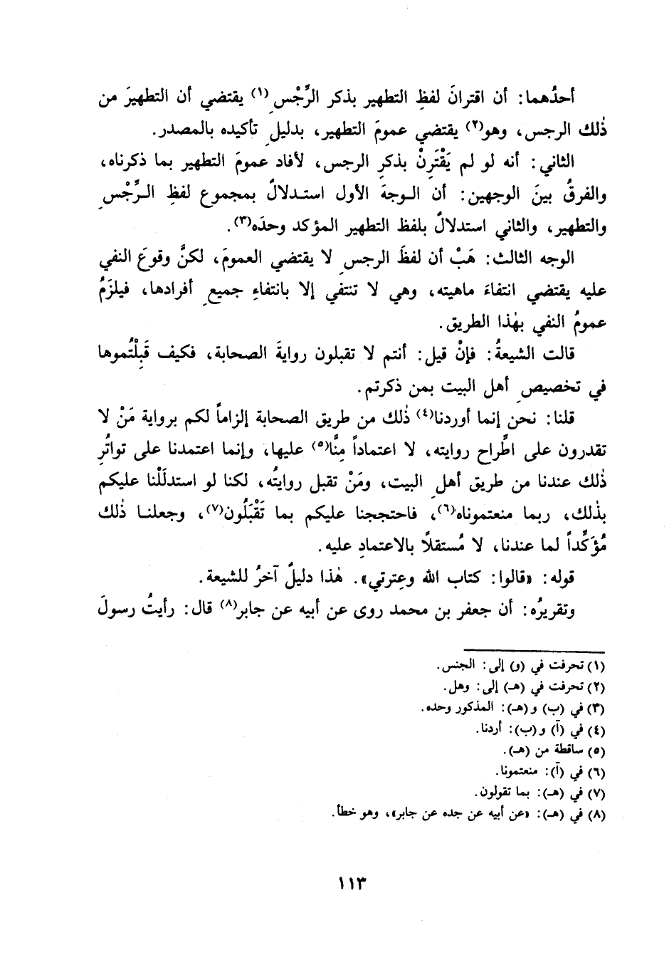 أَحَدُهُمَا: أَنَّ اقْتِرَانَ لَفْظِ التَّطْهِيرِ بِذِكْرِ الرِّجْسِ يَقْتَضِي أَنَّ التَّطْهِيرَ مِنْ ذَلِكَ الرِّجْسِ، وَهُوَ يَقْتَضِي عُمُومَ التَّطْهِيرِ، بِدَلِيلِ تَأْكِيدِهِ بِالْمَصْدَرِ.