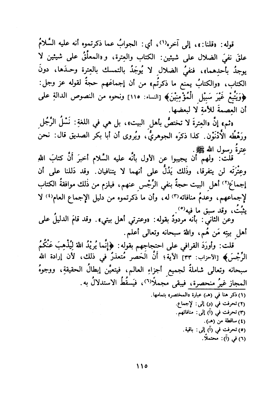 قَوْلُهُ: " قُلْنَا: " إِلَى آخِرِهِ، أَيِ: الْجَوَابُ عَمَّا ذَكَرْتُمُوهُ أَنَّهُ - عَلَيْهِ السَّلَامُ - عَلَّقَ نَفْيَ الضَّلَالِ عَلَى شَيْئَيْنِ: الْكِتَابِ وَالْعِتْرَةِ، و" الْمُعَلَّقُ عَلَى شَيْئَيْنِ لَا يُوجَدُ بِأَحَدِهِمَا " فَنَفْيُ الضَّلَالِ لَا يُوجَدُ بِالتَّمَسُّكِ بِالْعِتْرَةِ وَحْدَهَا، دُونَ الْكِتَابِ " وَالْكِتَابُ يَمْنَعُ مَا ذَكَرْتُمْ " مِنْ أَنَّ إِجْمَاعَهُمْ حُجَّةٌ لِقَوْلِهِ - عَزَّ وَجَلَّ -: {وَيَتَّبِعْ غَيْرَ سَبِيلِ الْمُؤْمِنِينَ} [النِّسَاءِ: 115] وَنَحْوِهِ مِنَ النُّصُوصِ الدَّالَّةِ عَلَى أَنَّ الْعِصْمَةَ لِلْأُمَّةِ لَا لِبَعْضِهَا.