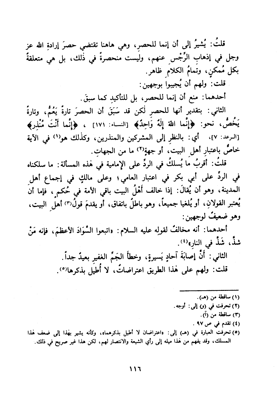قُلْتُ: يُشِيرُ إِلَى أَنَّ إِنَّمَا لِلْحَصْرِ، وَهِيَ هَاهُنَا تَقْتَضِي حَصْرَ إِرَادَةِ اللَّهِ - عَزَّ وَجَلَّ - فِي إِذْهَابِ الرِّجْسِ عَنْهُمْ، وَلَيْسَتْ مُنْحَصِرَةً فِي ذَلِكَ، بَلْ هِيَ مُتَعَلِّقَةٌ بِكُلِّ مُمْكِنٍ، وَتَمَامُ الْكَلَامِ ظَاهِرٌ.