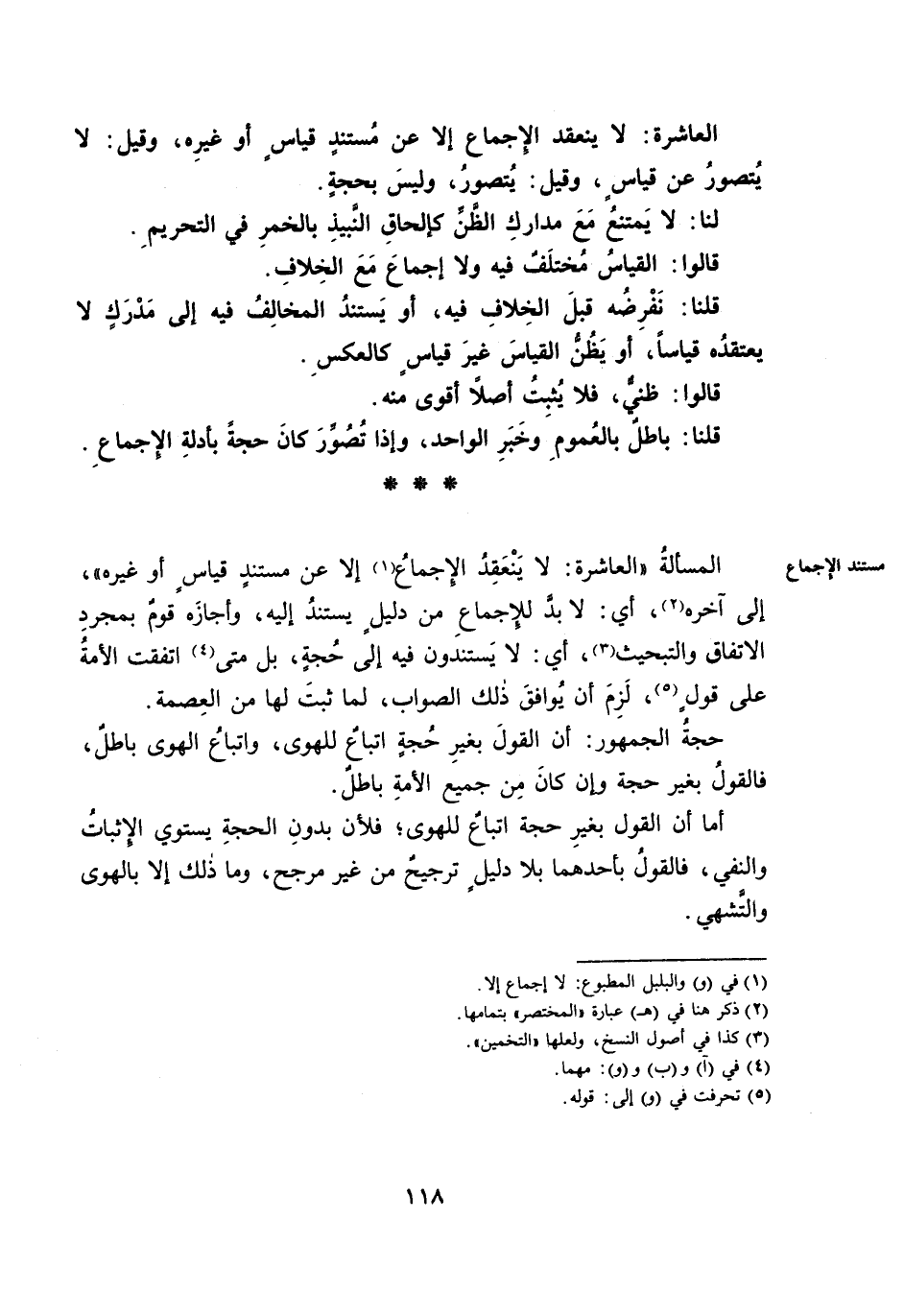 الْمَسْأَلَةُ " الْعَاشِرَةُ: لَا يَنْعَقِدُ الْإِجْمَاعُ إِلَّا عَنْ مُسْتَنَدٍ قِيَاسٍ أَوْ غَيْرِهِ " إِلَى آخِرِهِ، أَيْ: لَا بُدَّ لِلْإِجْمَاعِ مِنْ دَلِيلٍ يَسْتَنِدُ إِلَيْهِ، وَأَجَازَهُ قَوْمٌ بِمُجَرَّدِ الِاتِّفَاقِ وَالتَّبْحِيثِ، أَيْ: لَا يَسْتَنِدُونَ فِيهِ إِلَى حُجَّةٍ، بَلْ مَتَى اتَّفَقَتِ الْأُمَّةُ عَلَى قَوْلٍ، لَزِمَ أَنْ يُوَافِقَ ذَلِكَ الصَّوَابَ، لِمَا ثَبَتَ لَهَا مِنَ الْعِصْمَةِ.