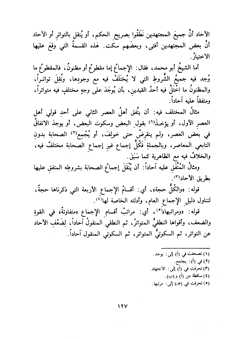 قَوْلُهُ: «وَمَرَاتِبُهَا» أَيْ: مَرَاتِبُ أَقْسَامِ الْإِجْمَاعِ «مُتَفَاوِتَةٌ» فِي الْقُوَّةِ وَالضَّعْفِ، وَأَقْوَاهَا النُّطْقِيُّ الْمُتَوَاتِرُ، ثُمَّ النُّطْقِيُّ الْمَنْقُولُ آحَادًا، لِضَعْفِ الْآحَادِ عَنِ التَّوَاتُرِ، ثُمَّ السُّكُوتِيُّ الْمُتَوَاتِرُ، ثُمَّ السُّكُوتِيُّ الْمَنْقُولُ آحَادًا.