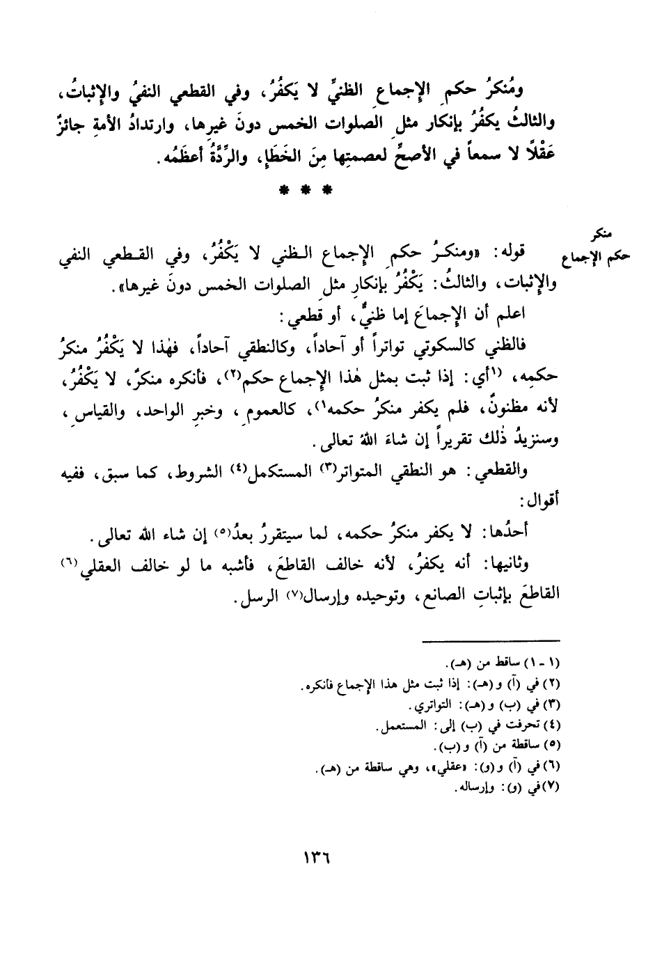 قَوْلُهُ: «وَمُنْكِرُ حُكْمِ الْإِجْمَاعِ الظَّنِّيِّ لَا يَكْفُرُ، وَفِي الْقَطْعِيِّ النَّفْيُ وَالْإِثْبَاتُ، وَالثَّالِثُ: يَكْفُرُ بِإِنْكَارِ مِثْلِ الصَّلَوَاتِ الْخَمْسِ دُونَ غَيْرِهَا» .