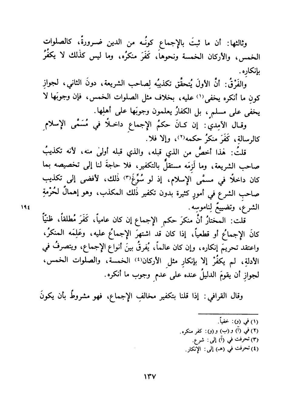 وَثَالِثُهَا: أَنَّ مَا ثَبَتَ بِالْإِجْمَاعِ كَوْنُهُ مِنَ الدِّينِ ضَرُورَةً، كَالصَّلَوَاتِ الْخَمْسِ، وَالْأَرْكَانِ الْخَمْسَةِ وَنَحْوِهَا، كَفَرَ مُنْكِرُهُ، وَمَا لَيْسَ كَذَلِكَ لَا يَكْفُرُ بِإِنْكَارِهِ.