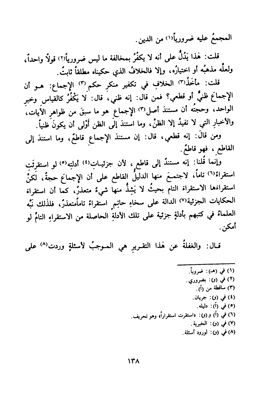قُلْتُ: هَذَا يَدُلُّ عَلَى أَنَّهُ لَا يَكْفُرُ بِمُخَالَفَةِ مَا لَيْسَ ضَرُورِيًّا قَوْلًا وَاحِدًا، وَلَعَلَّهُ مَذْهَبُهُ أَوِ اخْتِيَارُهُ، وَإِلَّا فَالْخِلَافُ الَّذِي حَكَيْنَاهُ مُطْلَقًا ثَابِتٌ.